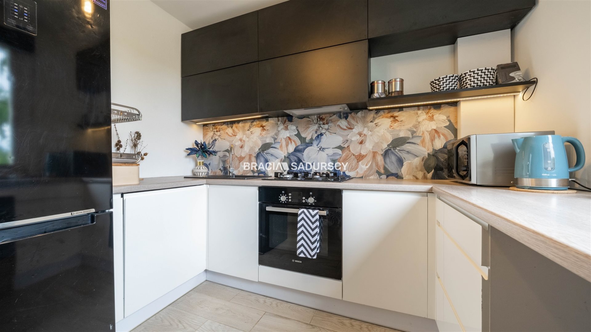 Kuchnia w pełni umeblowana i wyposażona w sprzęt AGD (zmywarka 60, piekarnik, płyta gazowa, okap, lodówka z zamrażarką).
