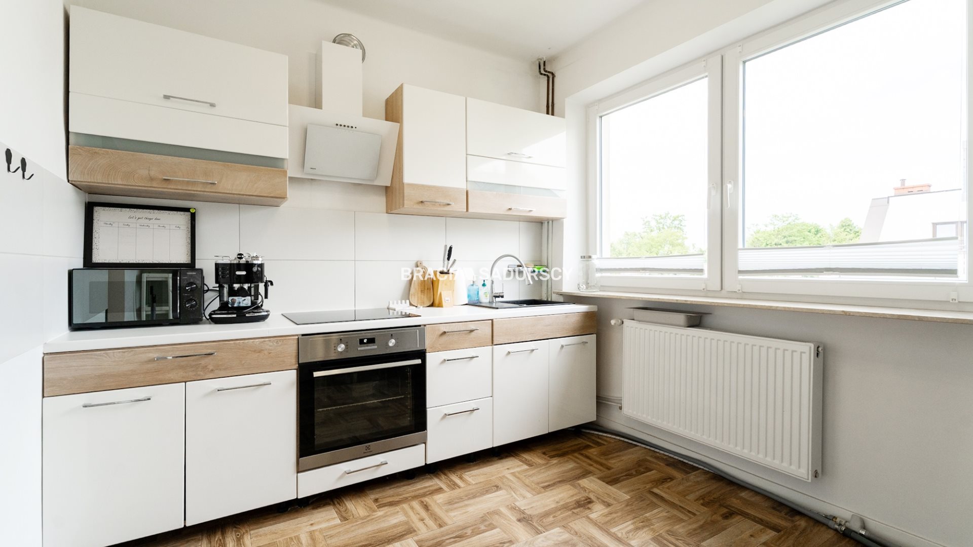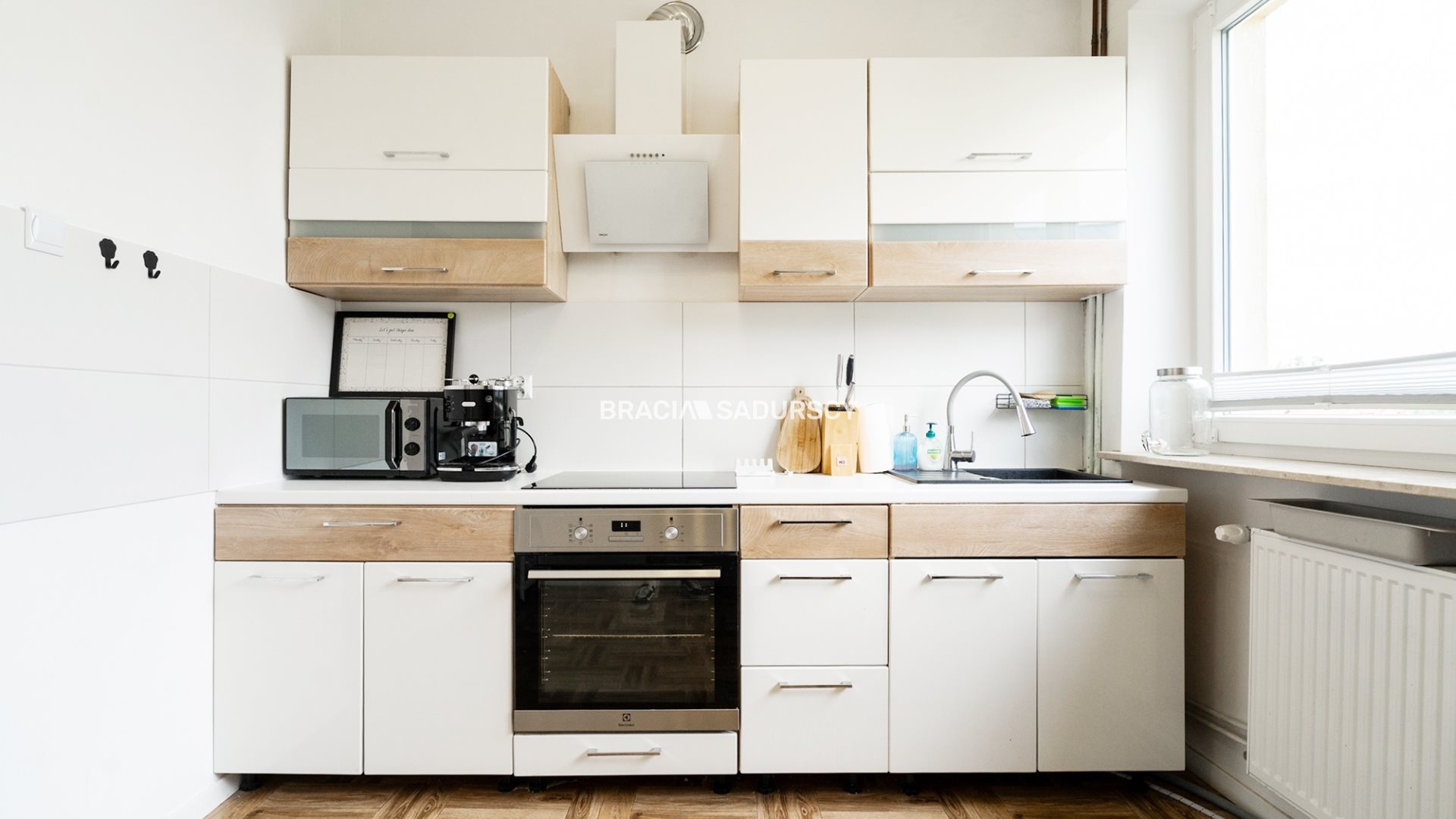 - Samodzielnej kuchni o powierzchni 9,5 m2. Ekspozycja okna na północ. Kuchnia jest wyposażona w meble wykonane na wymiar, zmywarkę 45 cm, płytę indukcyjną, piekarnik, lodówkę, okap.