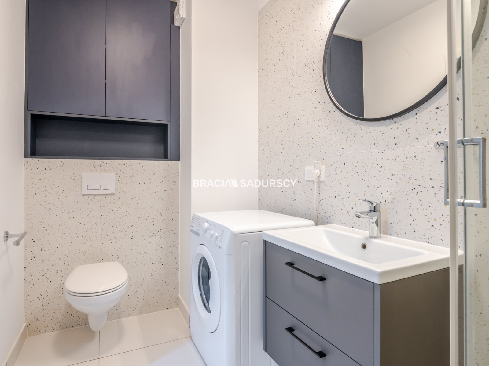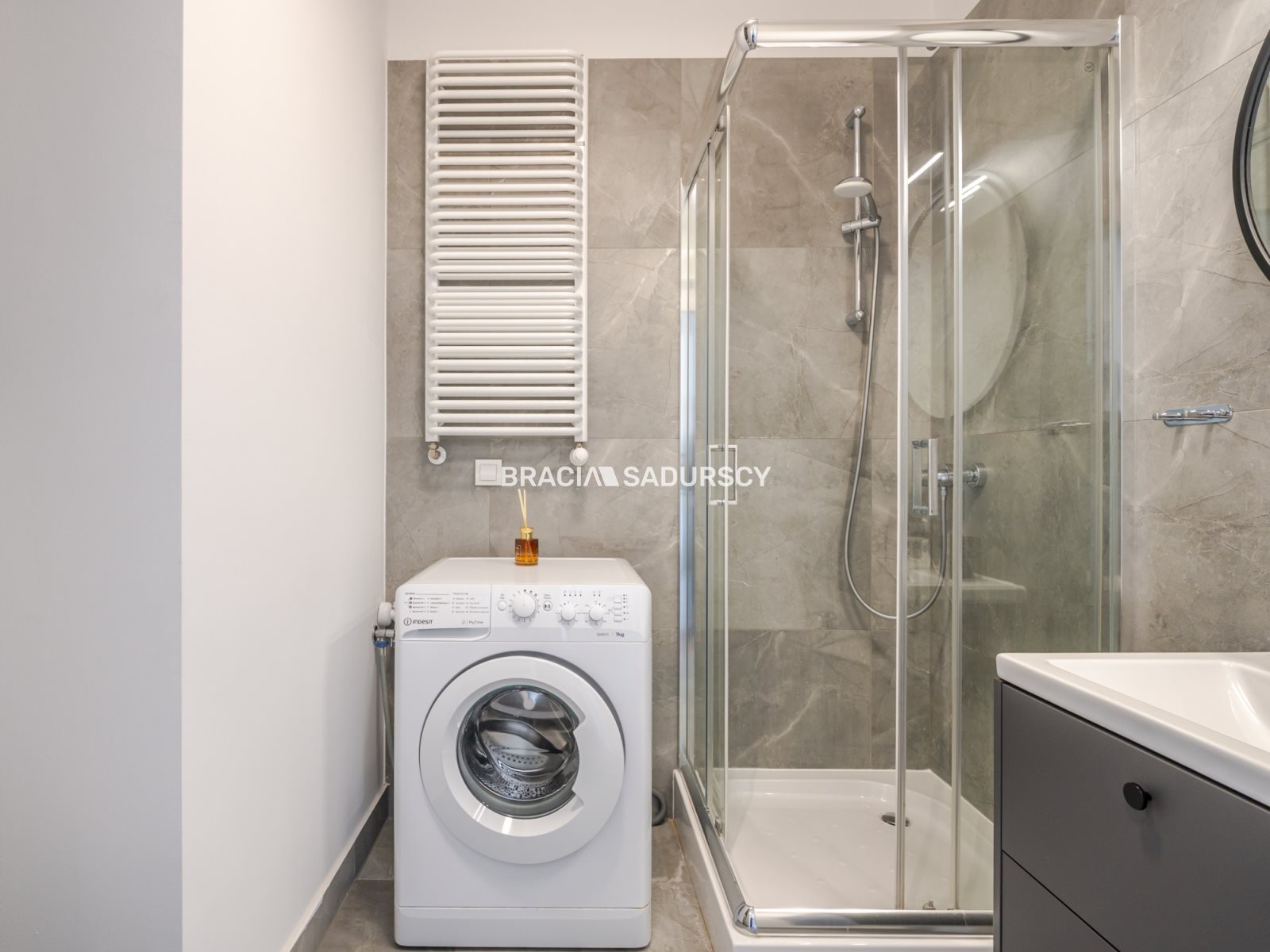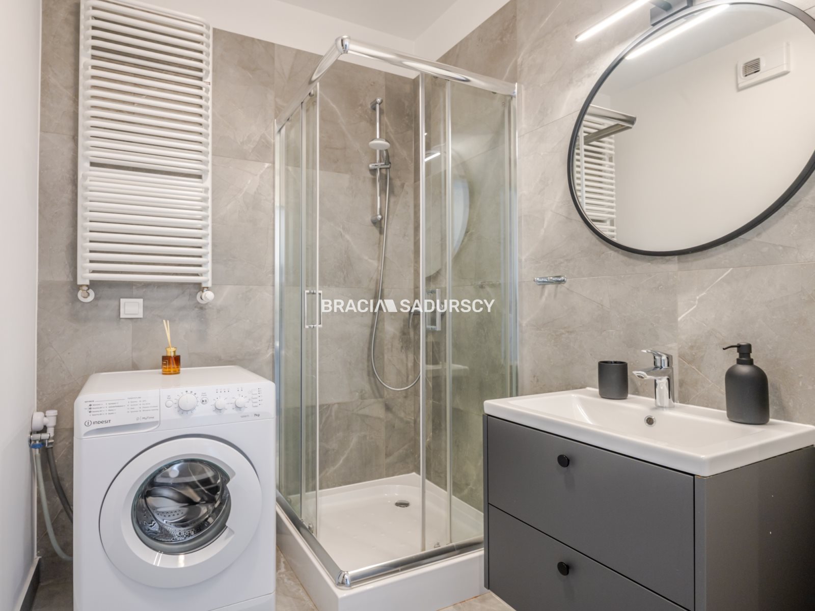 Łazienka: prysznic, pralka, szafka pod umywalką oraz szafka wisząca.