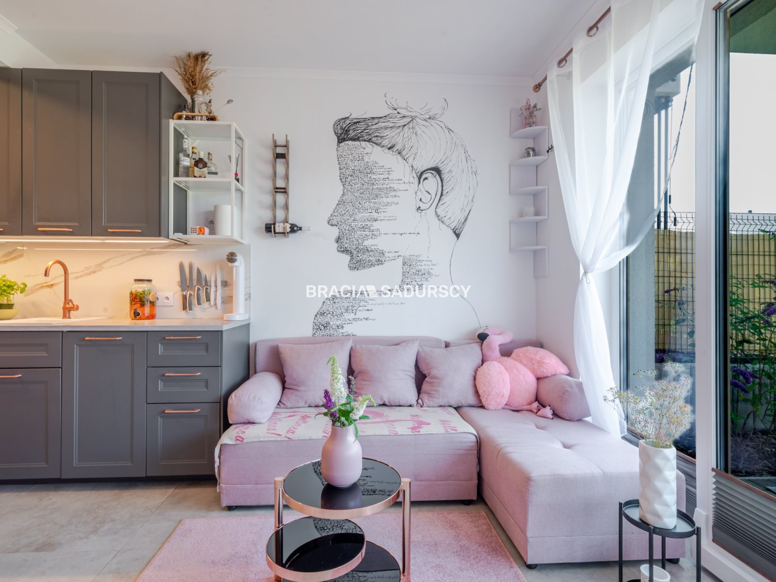 - przestronnego i jasnego salonu z aneksem kuchennym oraz wyjściem do ogródka