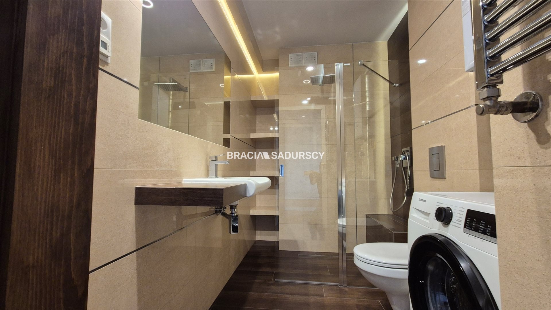 Przestronna łazienka z dużym prysznicem i deszczownicą, toaletą, umywalką oraz pralką, posiada także liczne półki na kosmetyki.