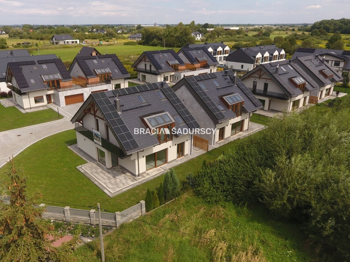 Osiedle jest w pełni ogrodzone, z unikalnym frontowym ogrodzeniem wykonanym na zamówienie z trwałego aluminium. Drogi wewnętrzne oraz miejsca parkingowe wyłożone są kostką brukową z systemem odwodnieniowym, zapewniając komfortowy dojazd do posesji. Wspólna infrastruktura, obejmująca ogrodzenie, wjazd oraz drogę wewnętrzną, została zaprojektowana z myślą o funkcjonalności i estetyce.