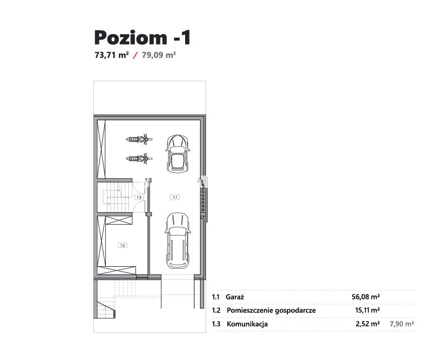 Łączna powierzchnia poziomu -1: 73,71 m²