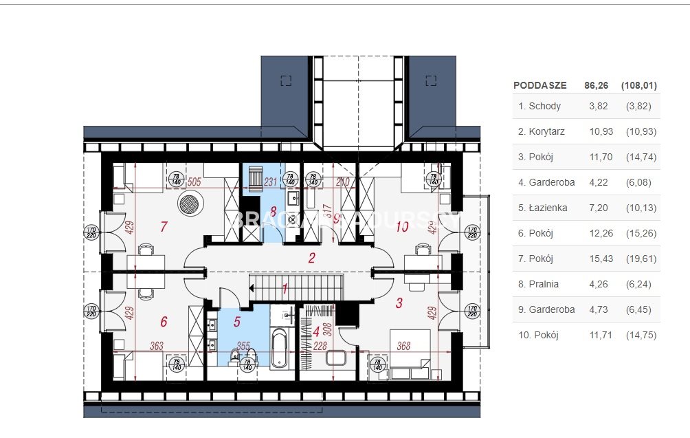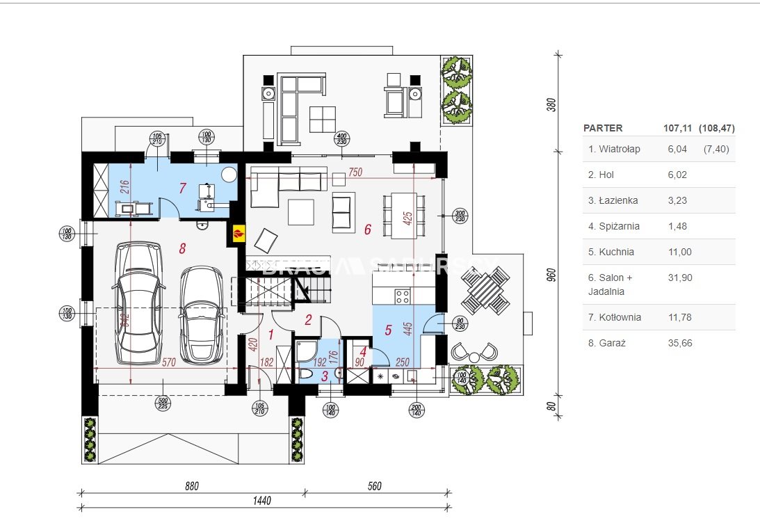 Parter składa się z wiatrołapu, łazienki, spiżarni, kuchni, salonu z jadalnią, kotłowni i garażu. Na poddaszu znajdują się cztery sypialnie, pralnia, garderoba, łazienka.