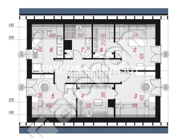 Poddasze zostało podniesione dzięki czemu nie ma skosów na piętrze.