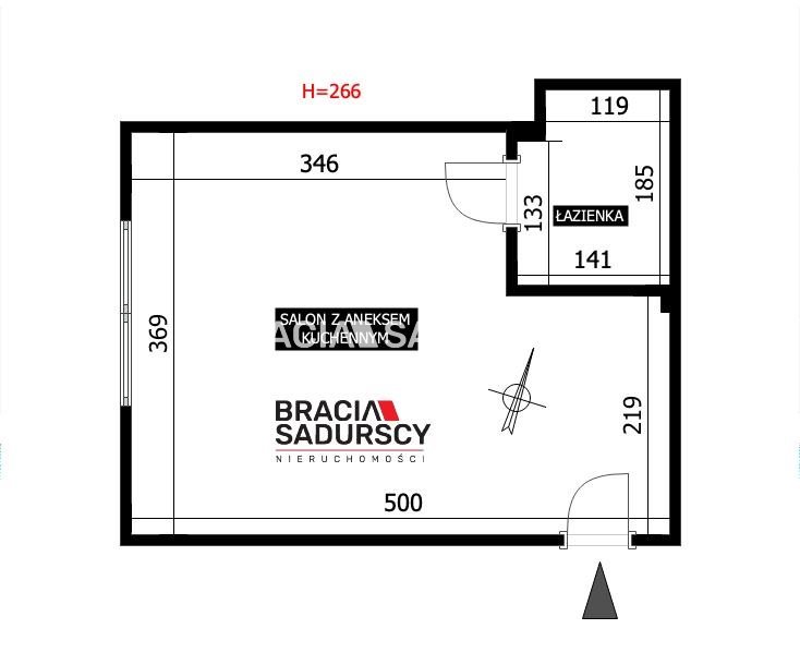 Układ: salon z aneksem kuchennym + łazienka z prysznicem