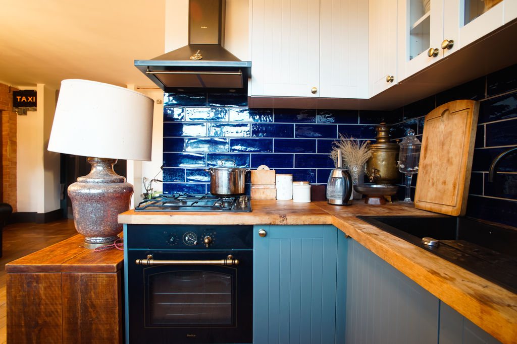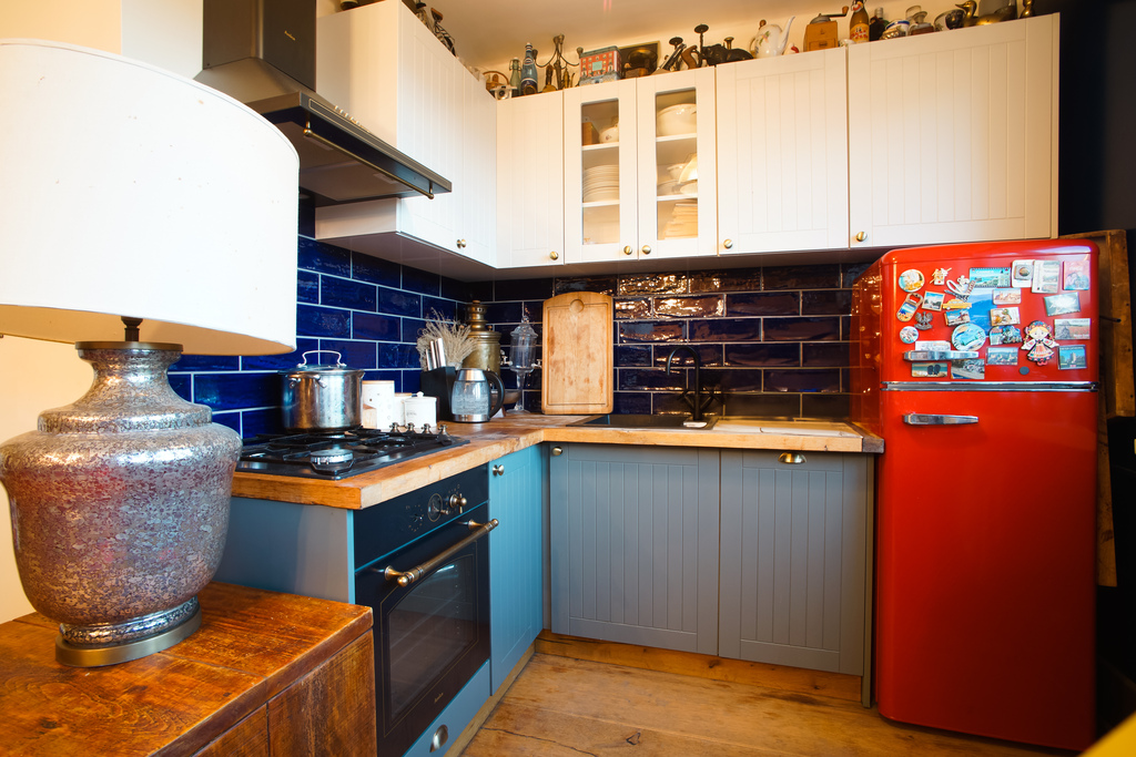 Kuchnia o niebanalnym designie to prawdziwy raj dla miłośników gotowania. Granatowe kafelki w połączeniu z jasnymi frontami i drewnianymi blatami nadają jej wyjątkowego charakteru. Uwagę przykuwa także czerwona lodówka w stylu retro. W pełni funkcjonalna, wyposażona w przestrzeń na nowoczesny sprzęt AGD.