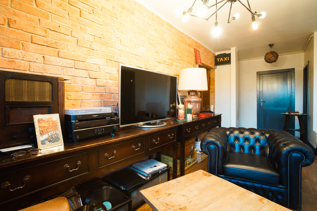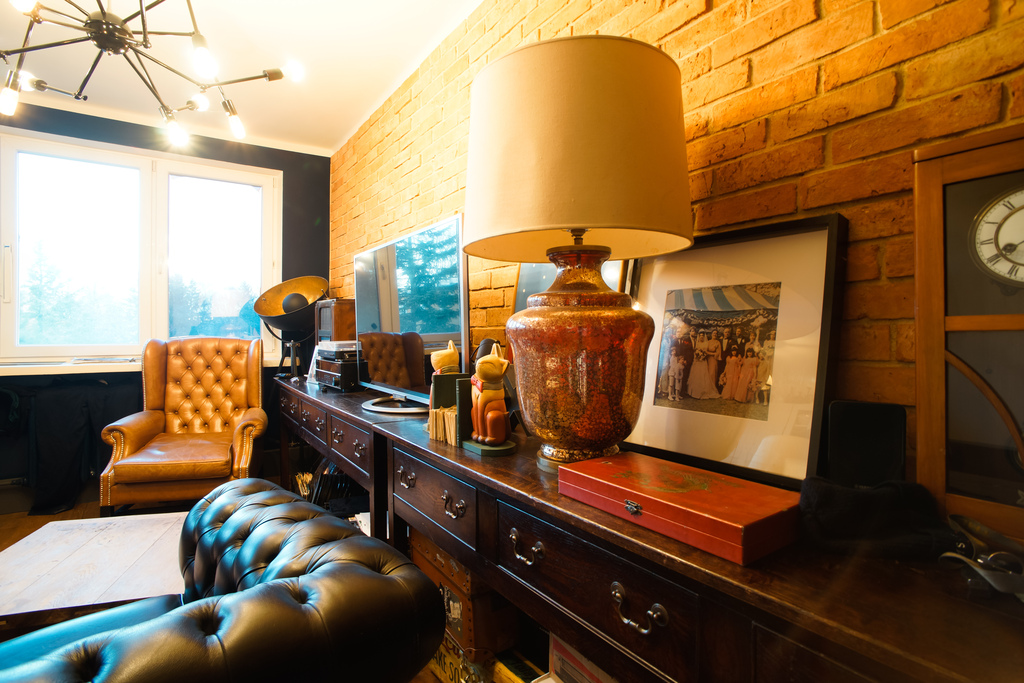 Elegancki salon z ceglaną ścianą i wykończeniem w stylu loftowym to prawdziwe serce mieszkania. Komfortowe fotele, kanapa Chesterfield i wyjątkowe oświetlenie tworzą klimat idealny do relaksu. Jest tu też przestrzeń na telewizor i dodatkowe elementy dekoracyjne, co czyni to miejsce idealnym do spędzania czasu z rodziną i przyjaciółmi.