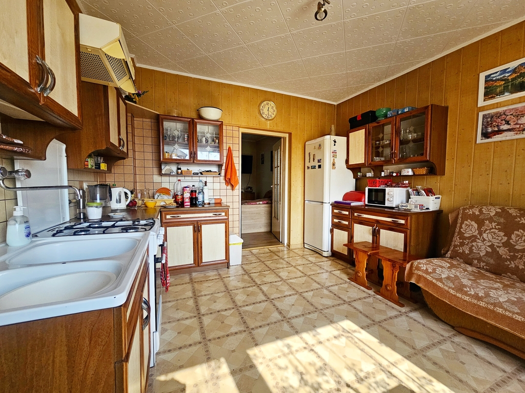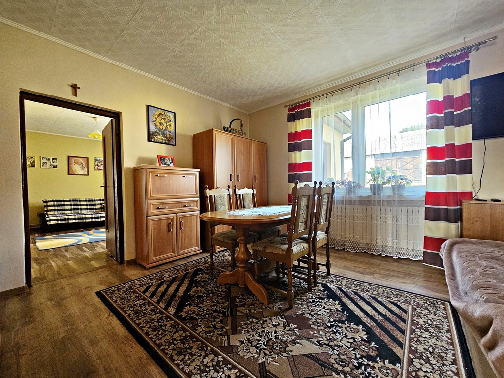 Parterowy budynek murowany z lat '70, o wymiarach ok 10 m x 8,5 m. Budynek składa się z trzech pokoi, kuchni, łazienki i ma układ przejściowy. Dodatkowo w połowie jest podpiwniczony oraz posiada wysoki strych (wejścia zarówno do piwnicy jak i na poddasze znajdują się na zewnątrz budynku). Dom posiada dwa wejścia - od strony ulicy/wjazdu oraz od podwórza, pokryty jest blachodachówką i posiada okna PCV. Budynek ma rozprowadzone centralne ogrzewanie z pieca na węgiel/drewno, dzięki któremu podgrzewana jest również woda w okresie zimowym. W okresie ciepłym, gorąca woda pochodzi w piecyka gazowego umiejscowionego w łazience.