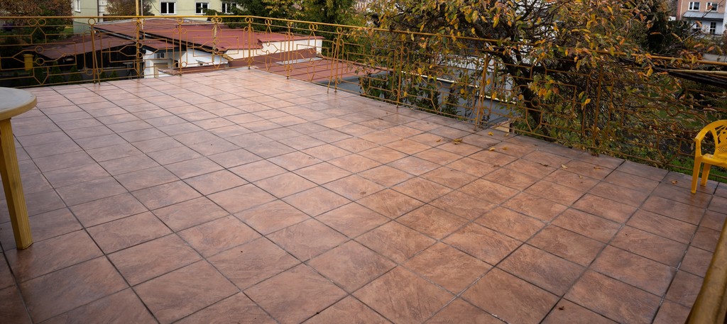 Piętro 1 - 3 nieprzechodnie sypialnie (13,6 m2, 15 m2, 12 m2). Korytarz 10 m2, na którego końcu znajduje się druga łazienka z wanną 4,6 m2. Z sypialni zlokalizowanej od frontu domu prowadzi wyjście na balkon, który otacza dom i połączony jest z tarasem z tyłu domu. Na taras można również wejść z drugiej sypialni położonej po drugiej stronie budynku. Taras 26 m2 połączony z balkonem dookoła domu - 16 m2. Klatka schodowa z pierwszego piętra prowadzi na