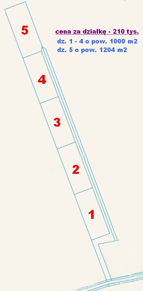 - działki nr 1-4 : powierzchnia pow. 1000 m²; wym. szer. 20m x dł. 50 m - cena 210 000 zł.