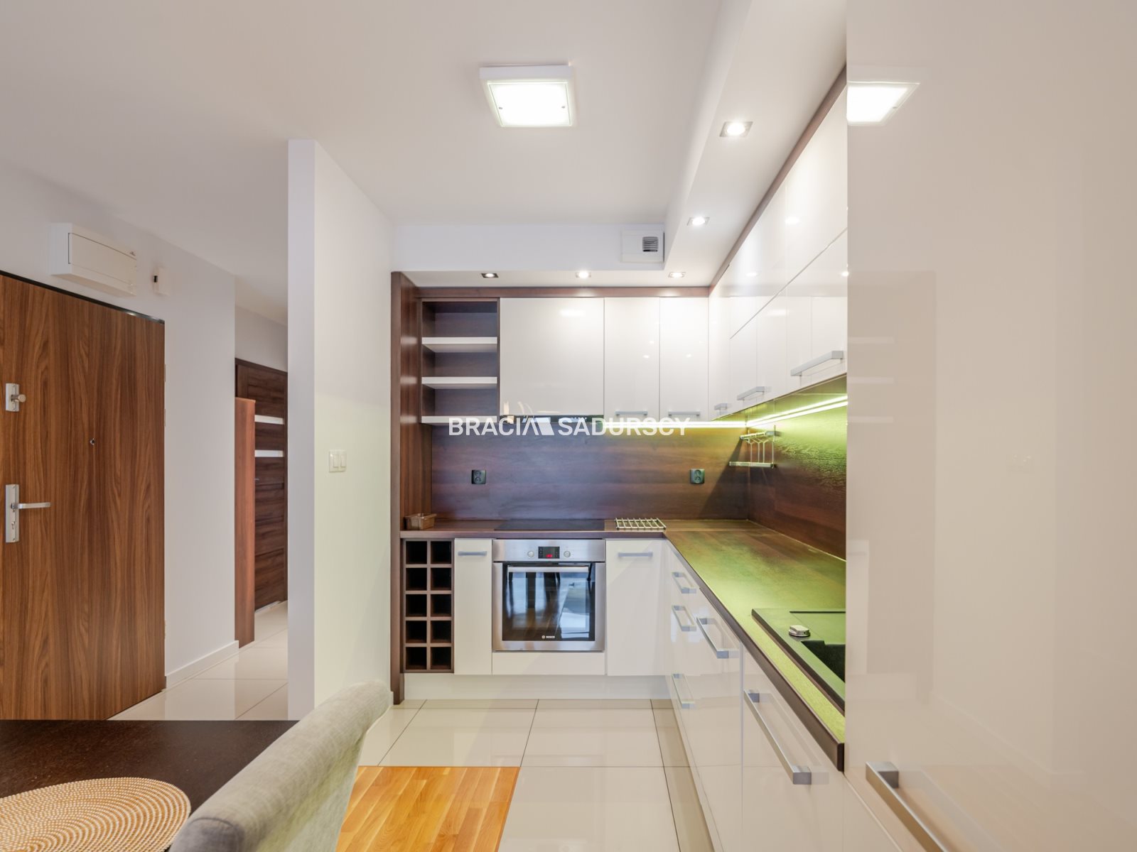 Mieszkanie jest w pełni umeblowane. Kuchnia wyposażona w kompletne AGD: piekarnik, płytę indukcyjną, zmywarkę oraz zestaw naczyń. W łazience znajduje się pralka.