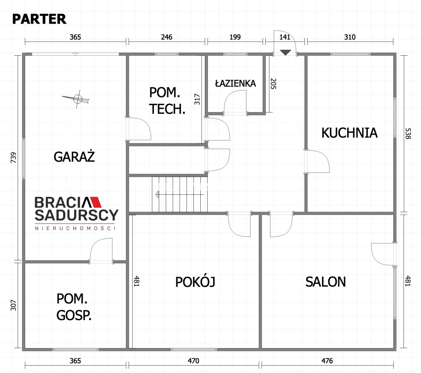 Parter budynku o pow. 136,14 m 2 , zawiera: 2 pokoje (22,6 m 2 , 22,9 m 2 ), osobną kuchnię (16,6 m 2 ), łazienkę (4,08 m 2 ), garaż (27,0 m 2 ), pomieszczenie gospodarcze (11,2 m 2 ), kotłownię (7,8 m 2 ) oraz przedpokój.