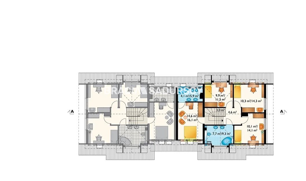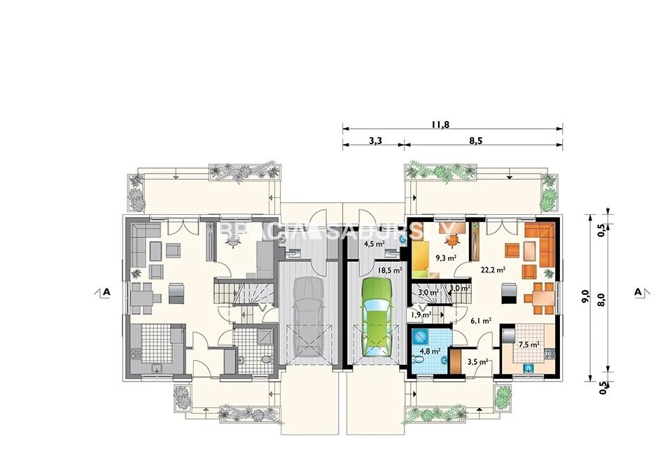Domy jednorodzinne w zabudowie bliźniaczej w Myślenicach, wg projektu Tosia Duo. Parterowy dom z użytkowym poddaszem przewidziany został, do zabudowy ścianą boczną pojedynczego garażu w granicy. Bryła składa się z części mieszkalnej i garażowej (z kotłownią) z osobnymi, dwuspadowymi dachami, z kalenicą równoległą do drogi dojazdowej. Części połączone są pod schodami przejściem ze schowkiem. Front zaakcentowano lukarną i obniżonym częściowo okapem. Na parterze, oprócz otwartego salonu, kuchni i dużej łazienki, schody betonowe z pomieszczeniem gospodarczym pod spodem. Cztery pokoje, na piętrze stworzą wygodny, rodzinny dom. Główna sypialnia ma własną łazienkę i oddzielona jest ustronnie od reszty strefy nocnej różnicą poziomów. Projekt domu Tosia Duo wykończono oszczędnie - bez balkonów, proponując jedynie delikatne zróżnicowanie odcieni i faktur tynku.