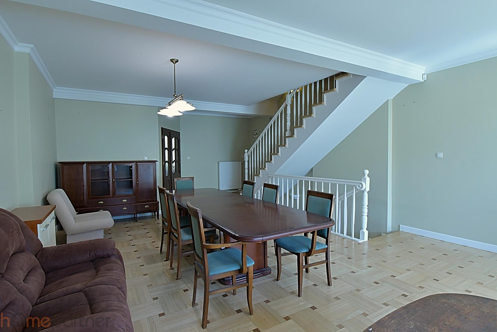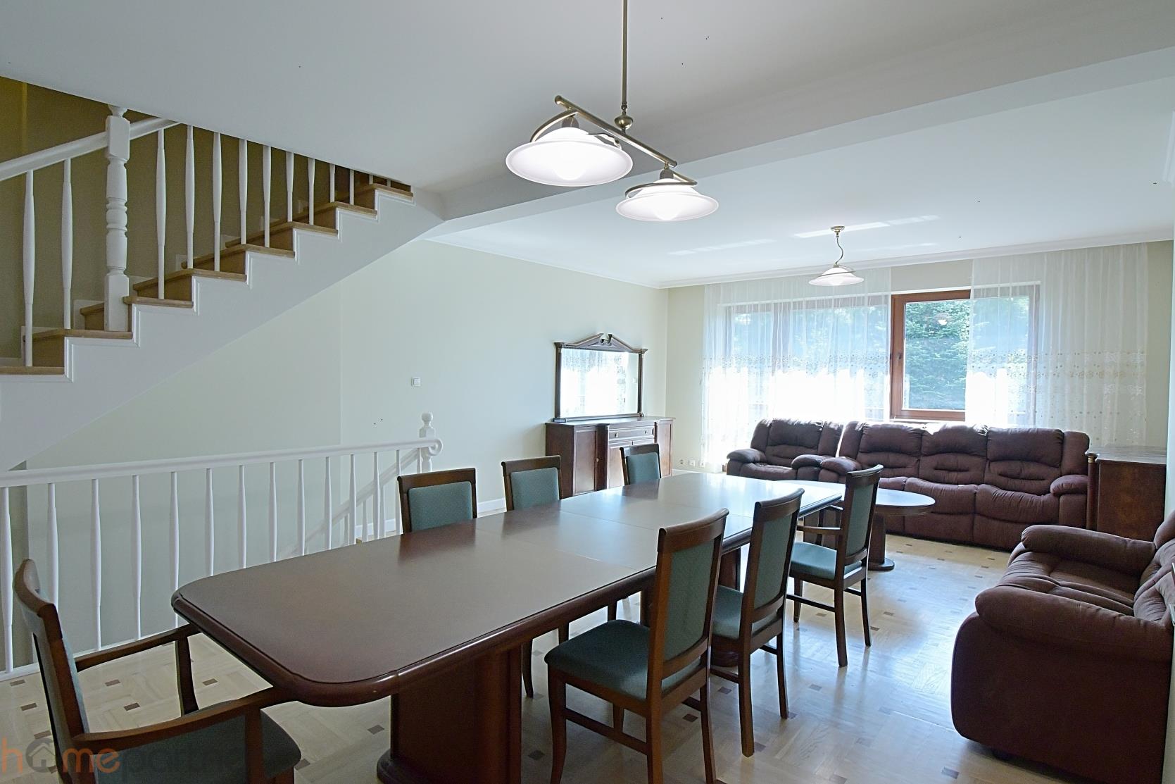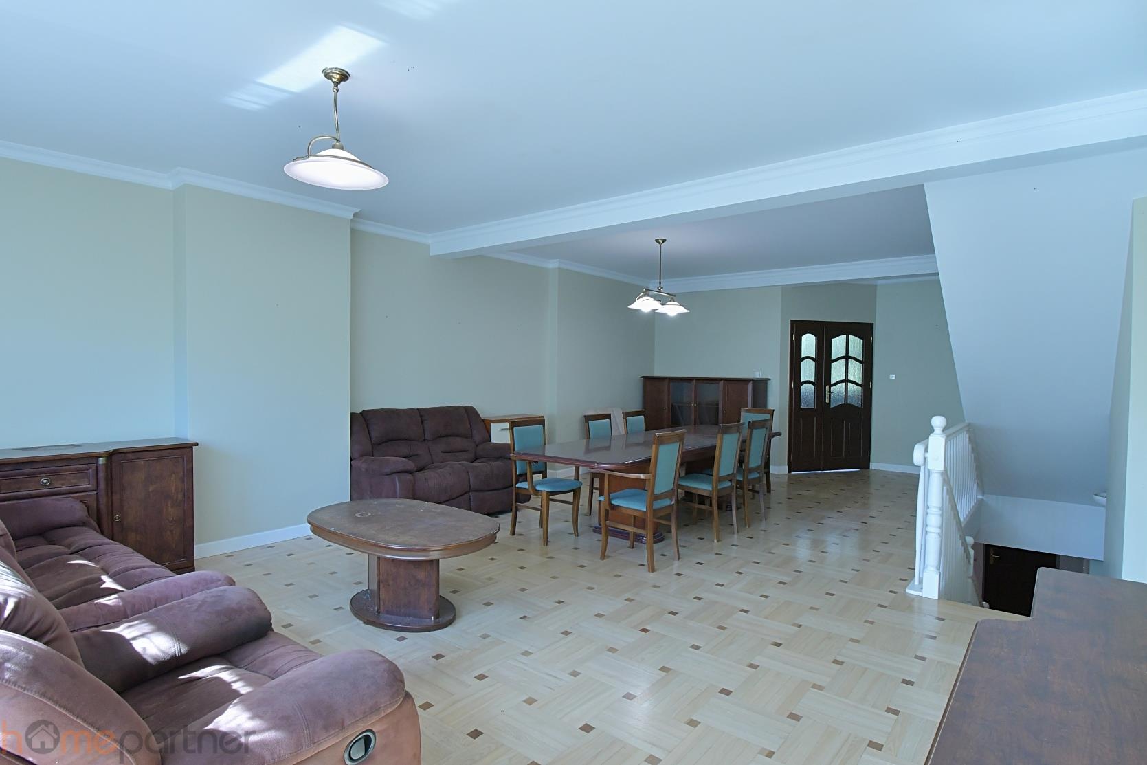 Salon wyposażony w obszerny narożnik, stół z 7 krzesłami. Salon posiada miejsce na kominek. Kuchnia drewniana w zabudowie, wyposażona w lodówko-zamrażarkę wolnostojącą Daewoo, płytę ceramiczną Smeg, piekarnik elektryczny wolnostojący Candy, mikrofalówkę Panasonic, okap, zmywarkę 60 cm Bosch. Trzy łazienki - dwie wyposażone w wanny oraz jedna z prysznicem. Ogrzewanie indywidualne, piec dwufunkcyjny gazowy z zasobnikiem , wymieniony 5 lat temu .Schody drewniane bukowe, w salonie podłoga drewniana, bukowa, w pozostałych pokojach parkiet. Granitowe parapety. Stolarka okienna drewniana, drzwiowa również drewniana. Na wszystkich tarasach wymieniona deska ok. 4 lat temu. W kuchni i łazienkach ogrzewanie podłogowe.