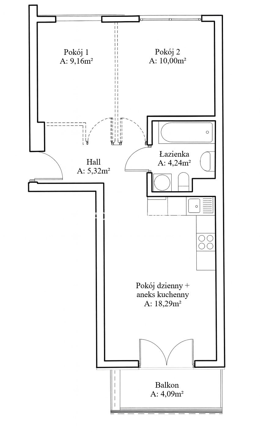 - jasny salon z aneksem kuchennym oraz wyjściem na słoneczny balkon (ok. 4,3 m²)