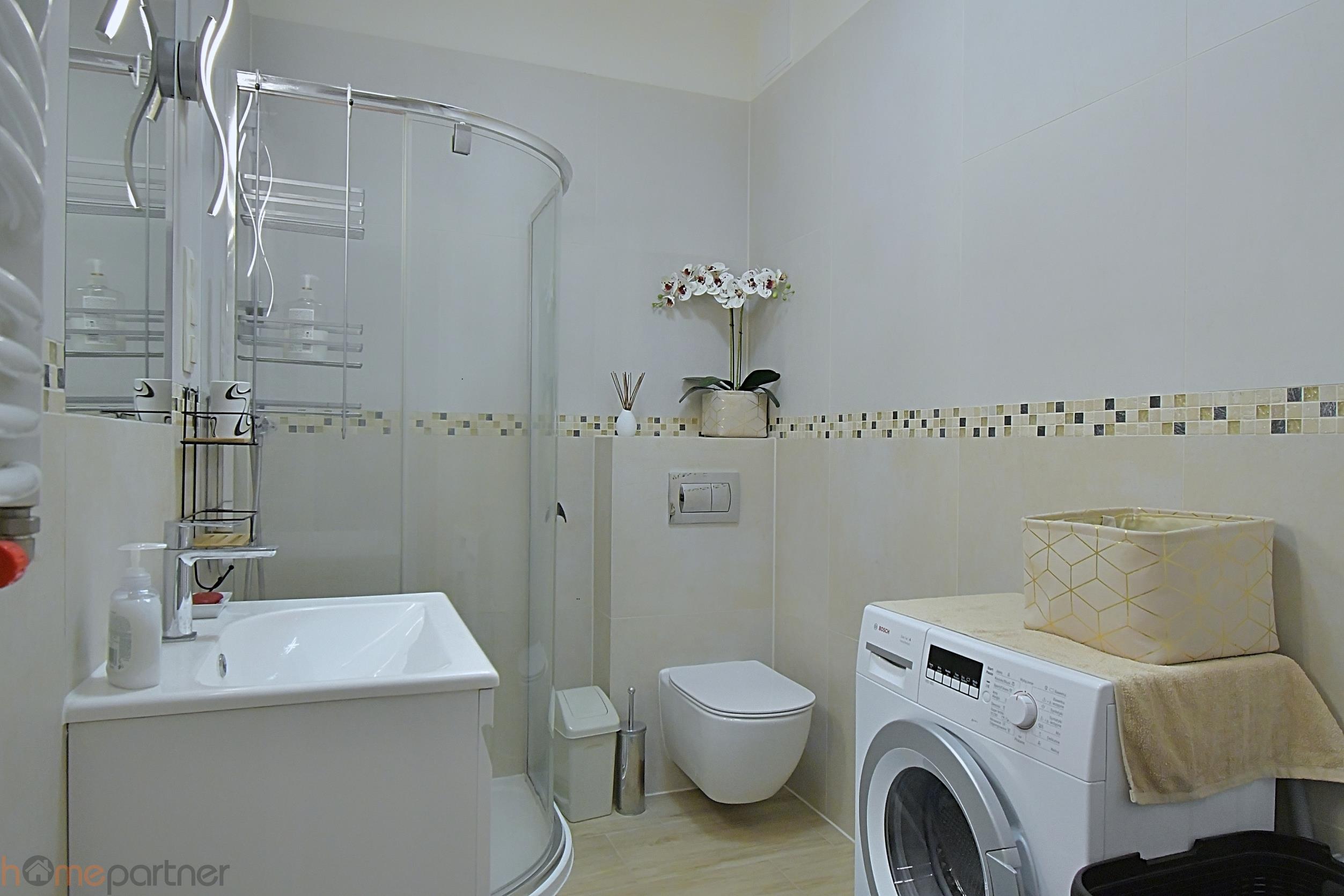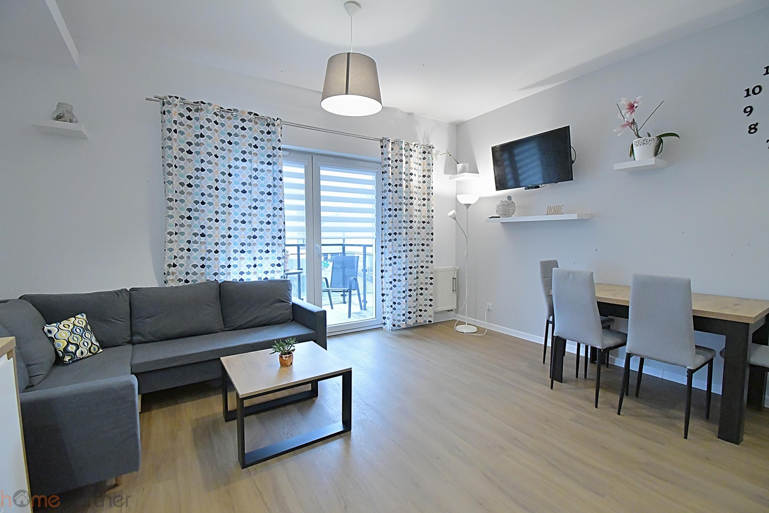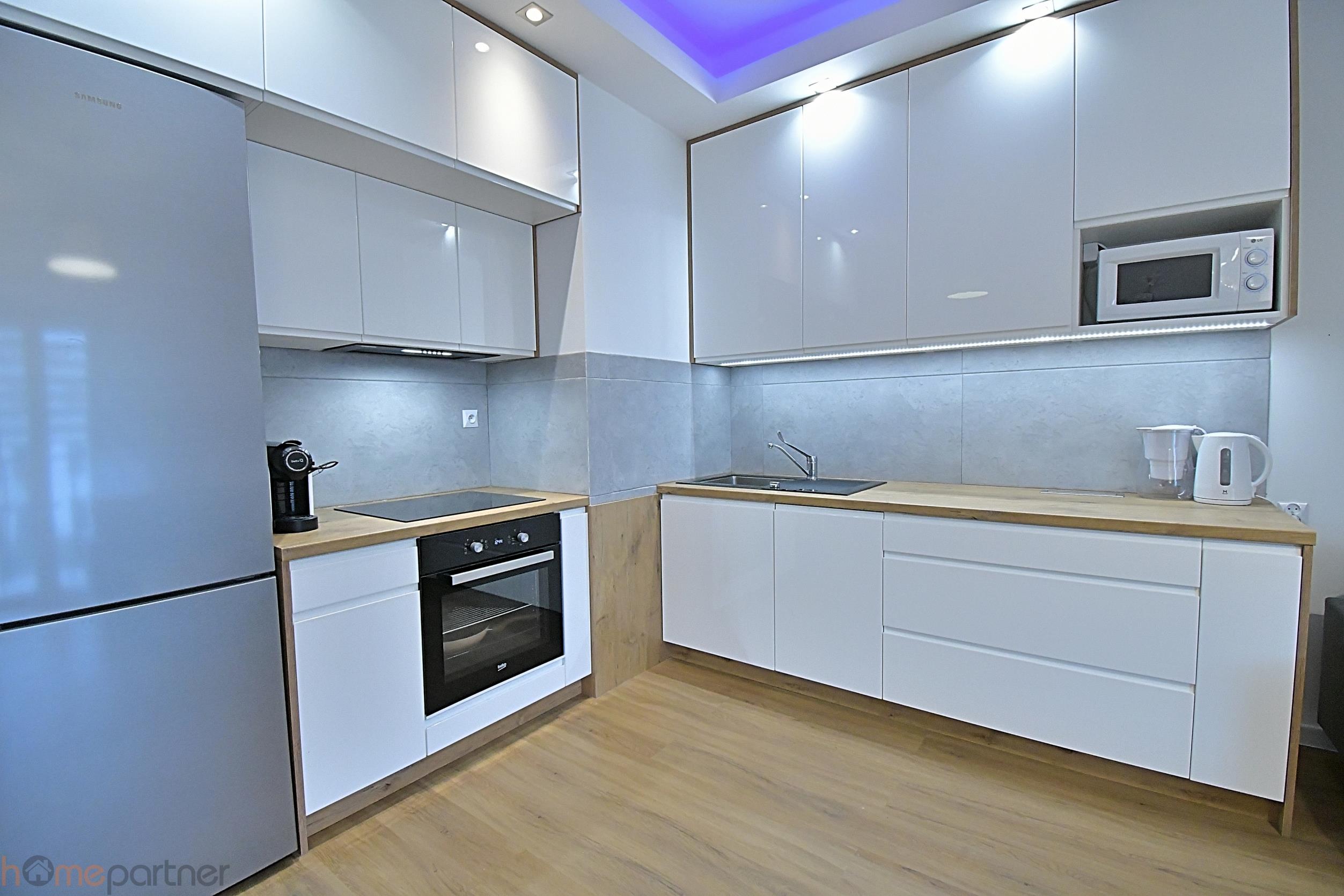 Mieszkanie jest umeblowane i nowocześnie zaaranżowane, wykończone zostało materiałami wysokiej klasy. Kuchnia w zabudowie wyposażona w lodówko-zamrażarkę, płytę indukcyjną, piekarnik, okap, zmywarkę, mikrofalówkę, ekspres na kapsułki, naczynia. Łazienka z natryskiem, pralka na wyposażeniu.