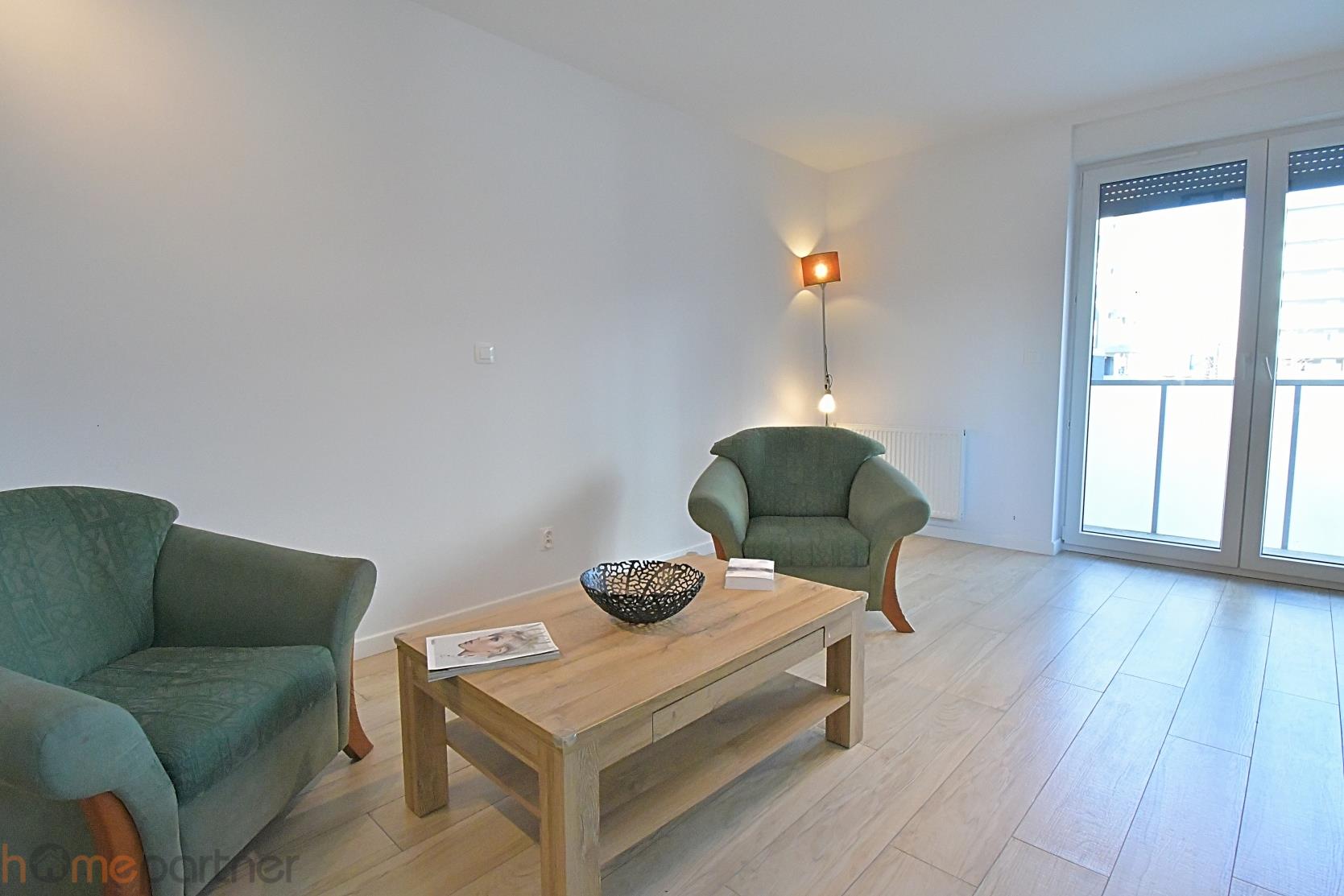 The apartment is partially furnished and designed in a modern style. The built-in kitchen is equipped with a fridge-freezer, induction hob, oven, hood, and a 60 cm dishwasher. All windows have external blinds, and each room is fitted with TV sockets. The bathroom features both a shower and a bathtub. There is also a utility room with a washer-dryer. The living room has access to a balcony. Bedroom 1 is equipped with a large bed and mattress, bedroom 2 has a bed frame, and bedroom 3 is ready to be furnished as needed. All appliances and furnishings are brand-new.