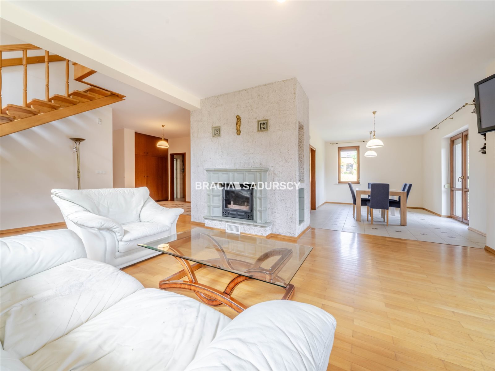 przestronny salon (37,9 m²) z kominkiem