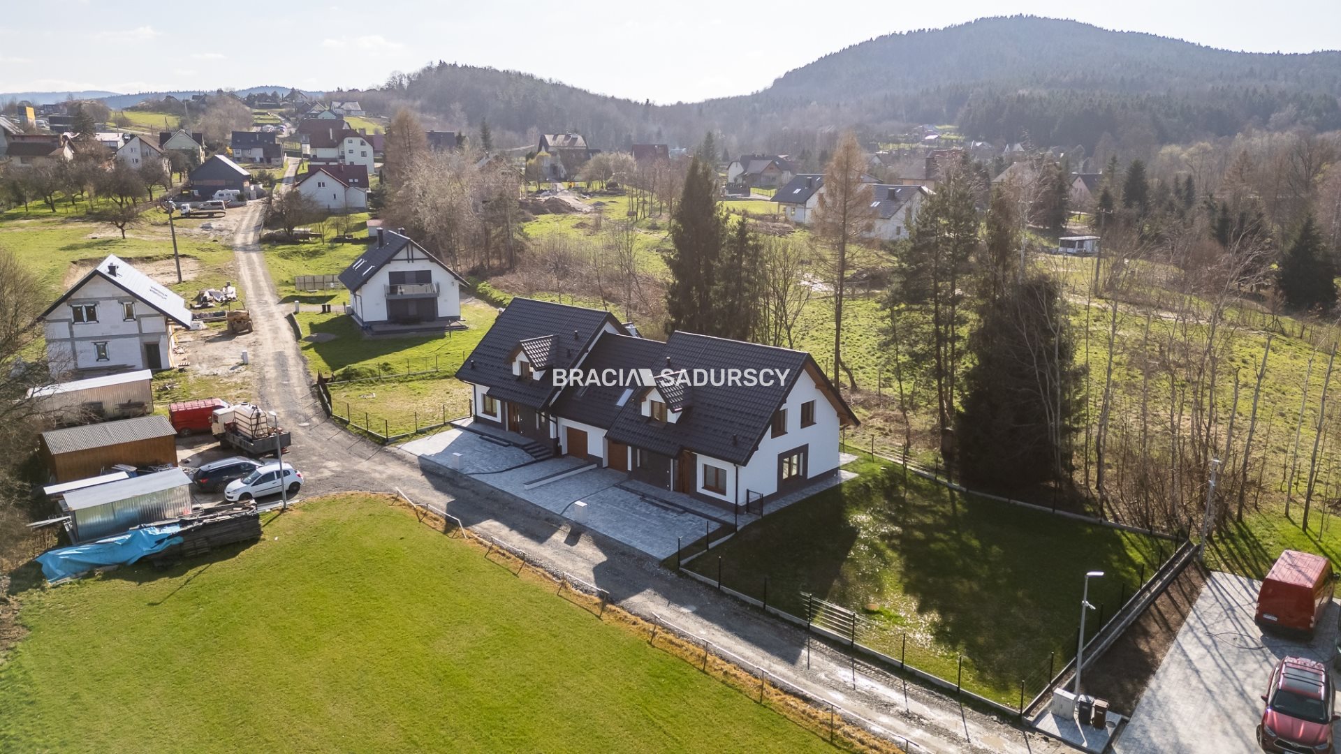 Domy jednorodzinne w zabudowie bliźniaczej w Myślenicach, wg projektu Tosia Duo. Parterowy dom z użytkowym poddaszem przewidziany został, do zabudowy ścianą boczną pojedynczego garażu w granicy. Bryła składa się z części mieszkalnej i garażowej (z kotłownią) z osobnymi, dwuspadowymi dachami, z kalenicą równoległą do drogi dojazdowej. Części połączone są pod schodami przejściem ze schowkiem. Front zaakcentowano lukarną i obniżonym częściowo okapem. Na parterze, oprócz otwartego salonu, kuchni i dużej łazienki, schody betonowe z pomieszczeniem gospodarczym pod spodem. Cztery pokoje, na piętrze stworzą wygodny, rodzinny dom. Główna sypialnia ma własną łazienkę i oddzielona jest ustronnie od reszty strefy nocnej różnicą poziomów. Projekt domu Tosia Duo wykończono oszczędnie - bez balkonów, proponując jedynie delikatne zróżnicowanie odcieni i faktur tynku.