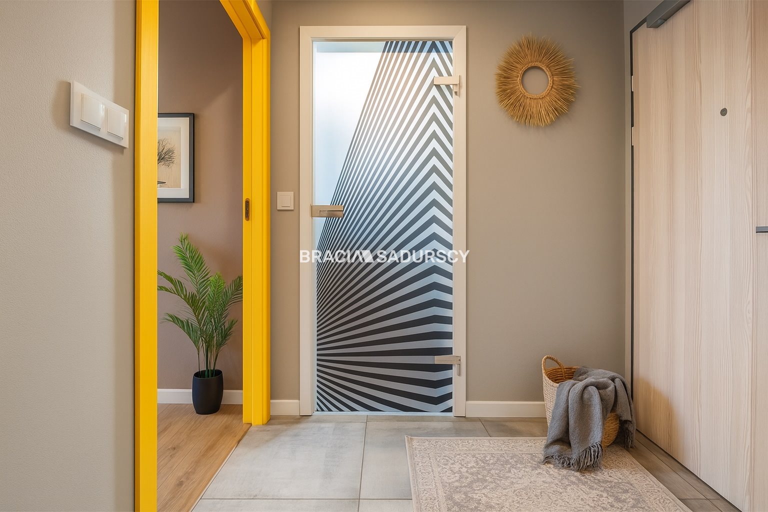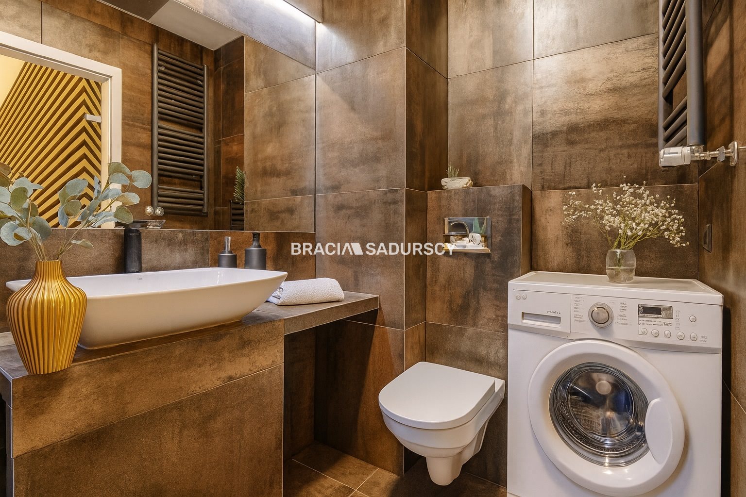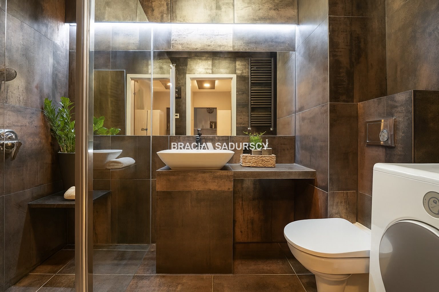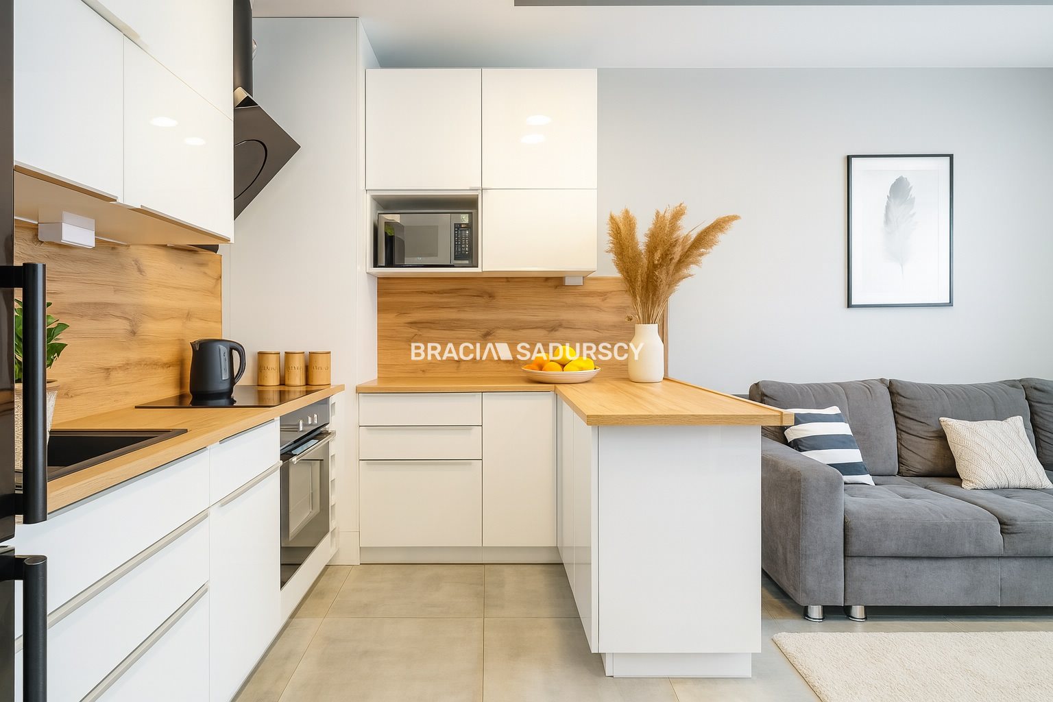 W łazience znajduje się prysznic bez brodzikowy, a kuchnia ma meble robione na wymiar.