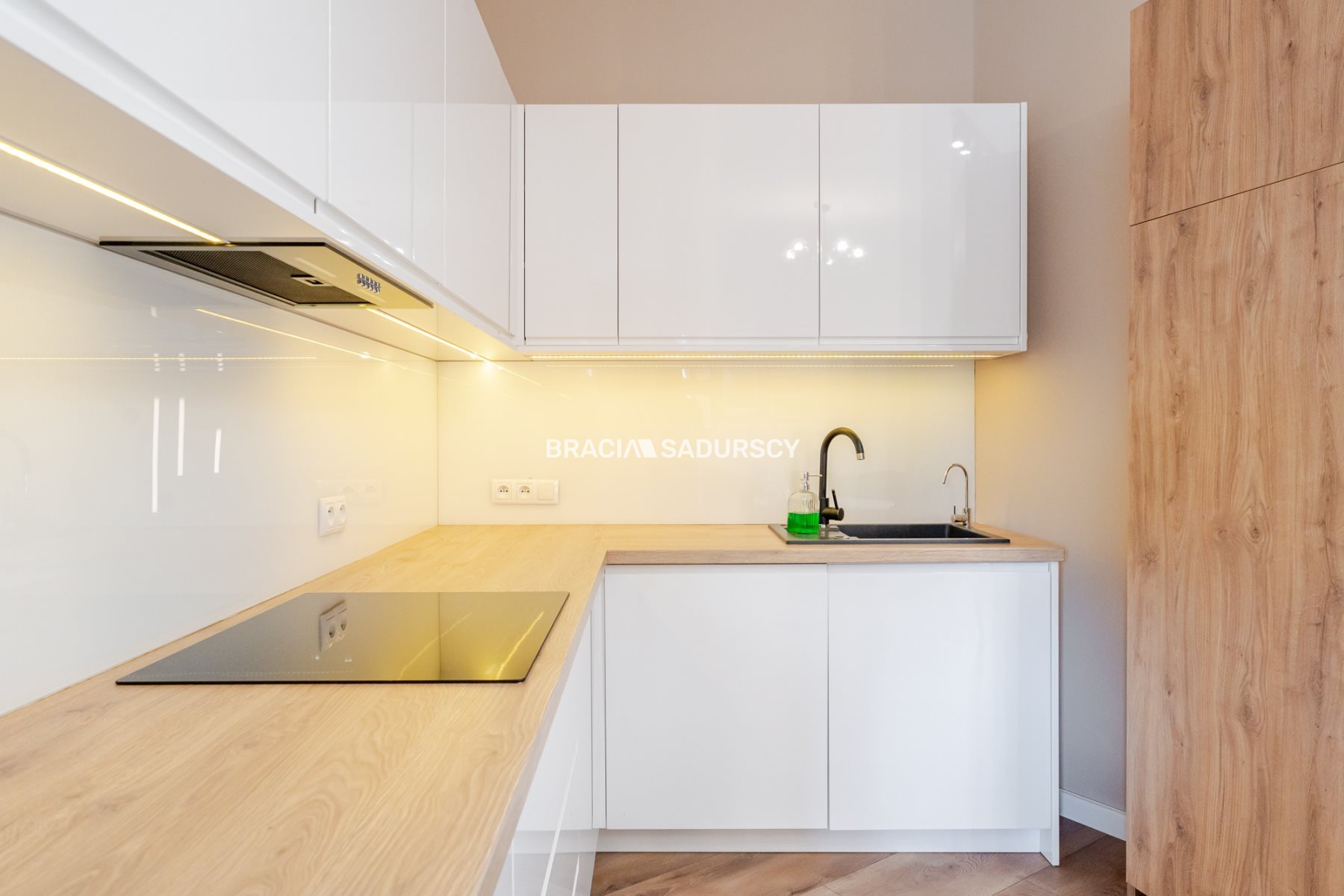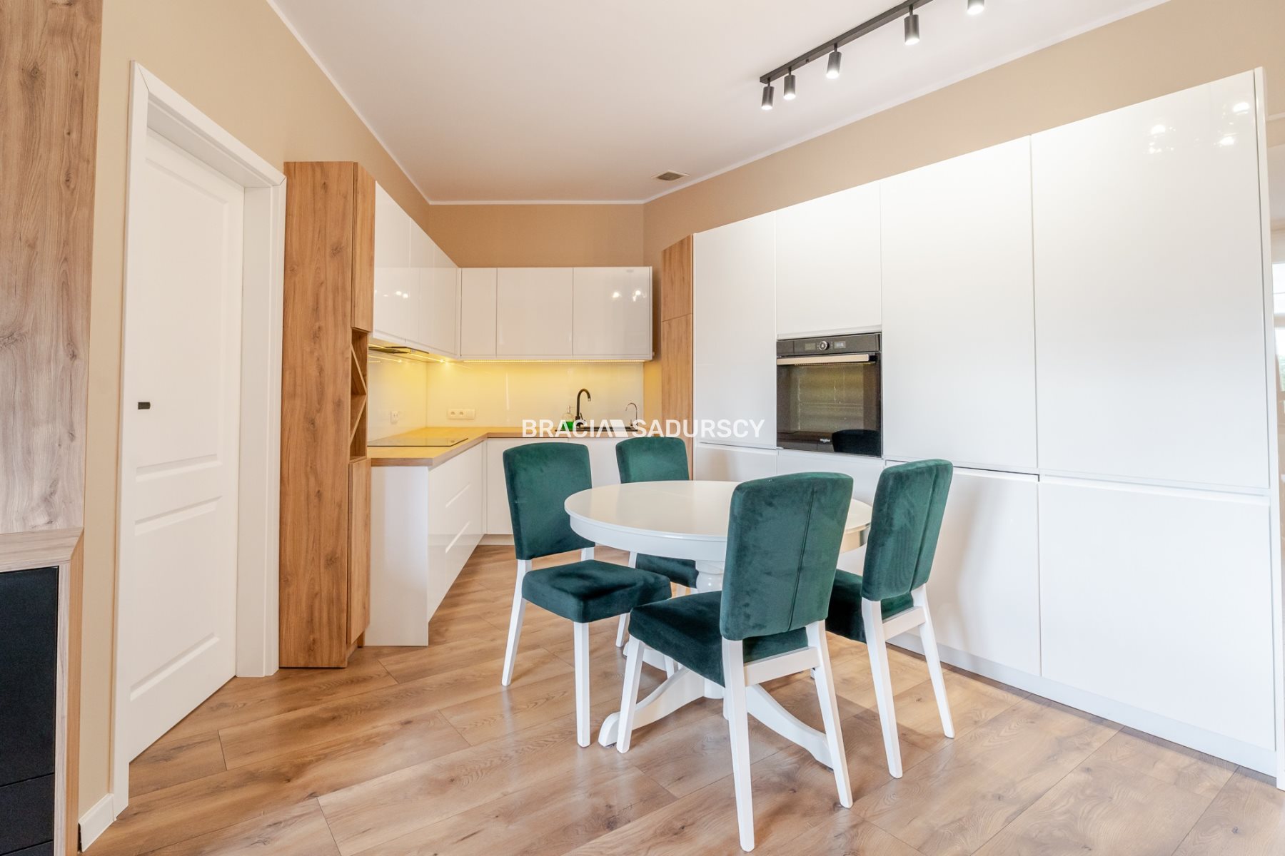 Meble w kuchni zostały wykonane na zamówienie. Sprzęt AGD: zmywarka 60 cm, lodówka, płyta indukcyjna z piekarnikiem z firmy Whirpool.