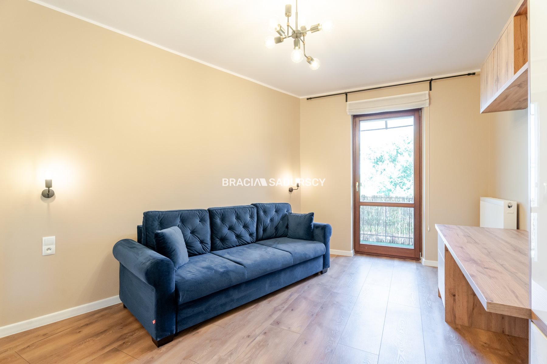 - Gabinet o pow. około 13 m2, z obszerną szafą i biurkiem, bez kanapy w kolorze granatowym. Widok na Wawel, oraz wyjście na niewielki ganek.