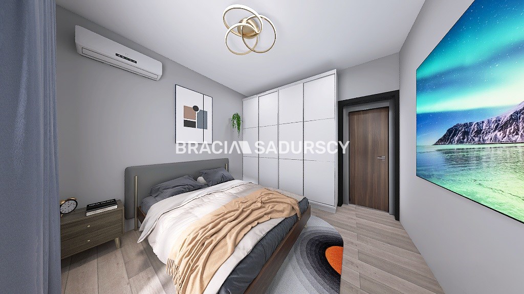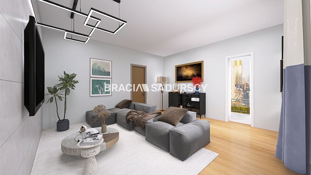 Mieszkanie jest wyjątkowo ustawne i pełne światła - ekspozycja południowo-zachodnia, dwa balkony (większy z widokiem na Kopiec Kościuszki oraz mniejszy narożny) sprawiają, że strefa dzienna jest przyjemna o każdej porze dnia. Obecny układ obejmuje przestronny salon z wyjściami na balkony, osobną kuchnię wyposażoną w meble, płytę indukcyjną, piekarnik i lodówkę oraz łazienkę z wanną, pralką i WC. W mieszkaniu nowe okna PCV; instalacja elektryczna w bardzo dobrym stanie (budynek z 2013 r.). Ogrzewanie miejskie, brak gazu w budynku - to wygoda i bezpieczeństwo na co dzień.
