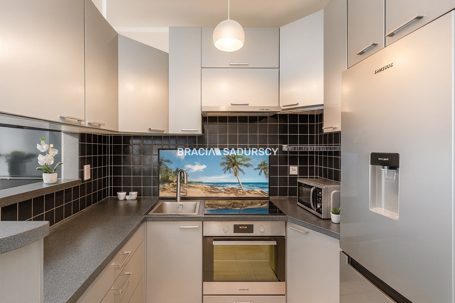 - Aneksu kuchennego, wyposażonego w lodówkę, piekarnik, płytę indukcyjną oraz zabudowę z dużą ilością blatów roboczych. Istnieje możliwość podłączenia zmywarki.