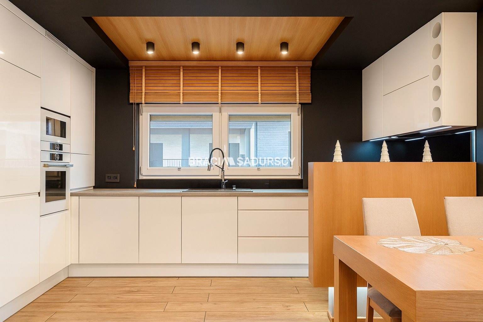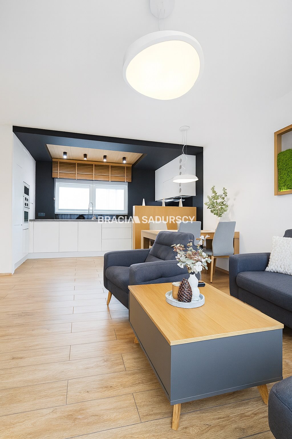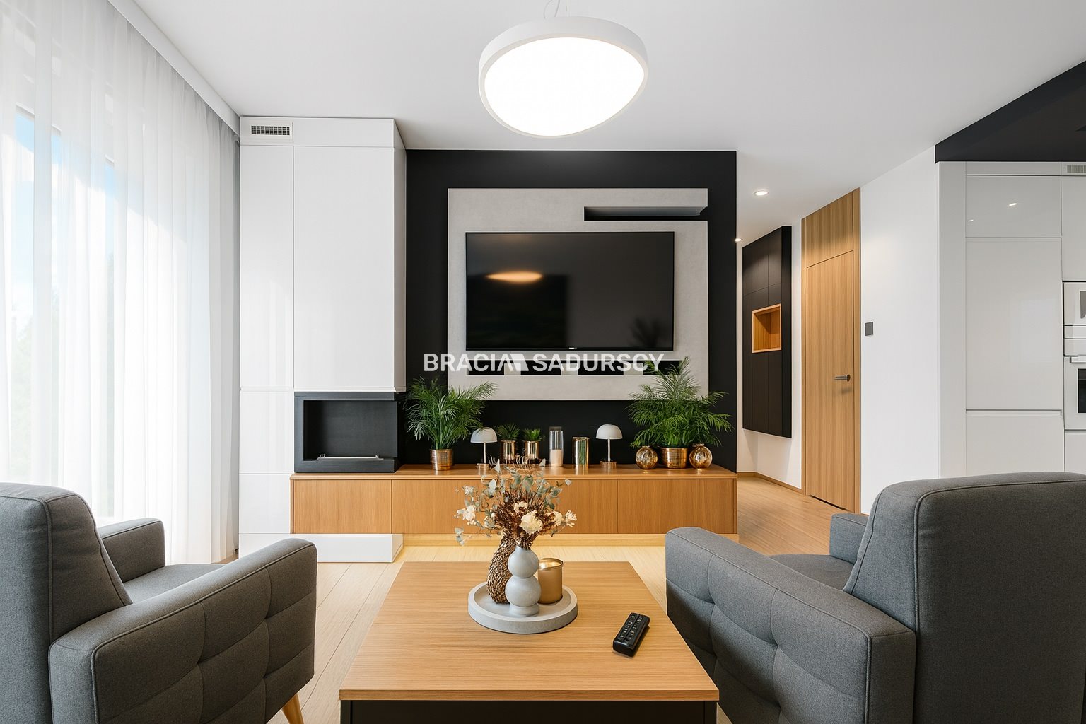 - Przestronny salon z kuchnią: otwarta strefa dzienna z zabudową meblową wykonaną na wymiar, lakierowanymi frontami w odcieniach szarości, bieli i czerni oraz okleiną dębową.