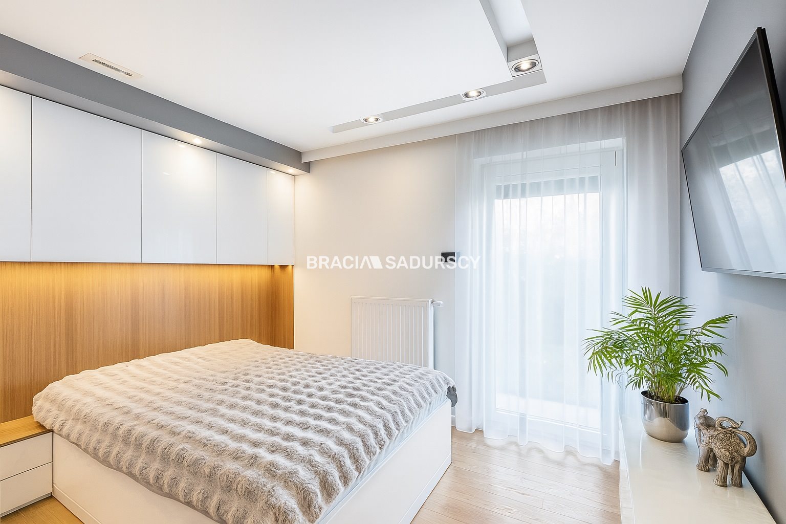 - Sypialnia z pełnowymiarowym łóżkiem i telewizorem smart‑TV.