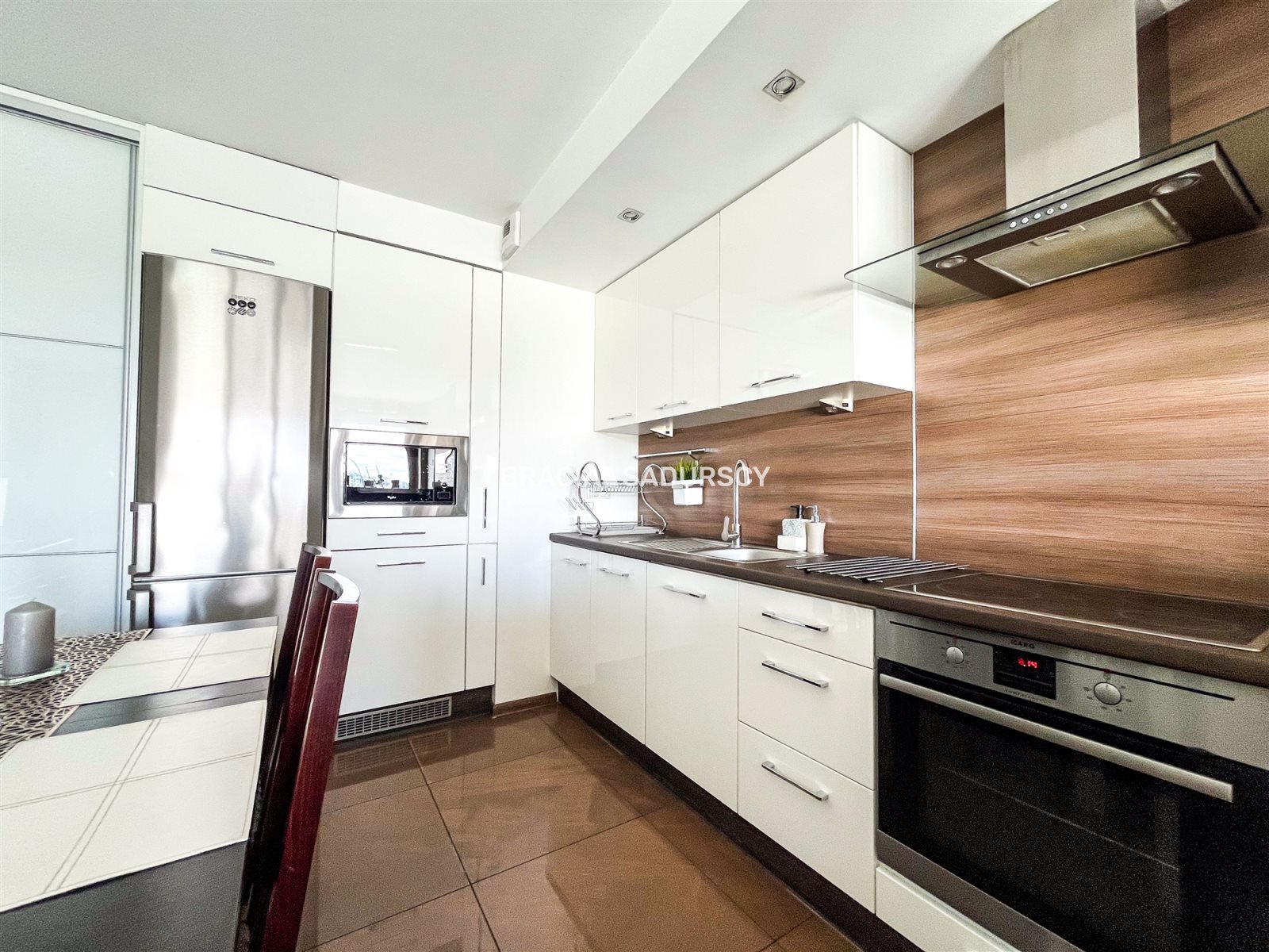 Mieszkanie posiada wszystkie potrzebne sprzęty AGD: lodówka, zmywarka, piekarnik, pralka, zestaw przyborów kuchennych, naczyń oraz wszelkie artykuły gospodarstwa domowego.