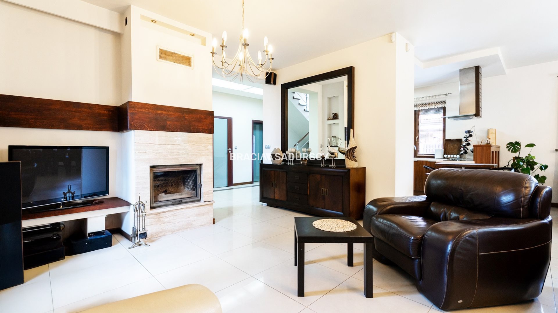 Z salonu jest wyjście na taras o pow. 18 m2, wyposażony w kameralną markizę z napędem elektrycznym. Piękny, wykonany z marmuru kominek / z zapasem wysuszonego drewna / odpowiednio nadaje temu funkcjonalnemu i obszernemu pomieszczeniu ciepły i domowy klimat. Ekspozycja okien na płn/zachód i płd/wschód zapewnia stały dostęp do światła dziennego.