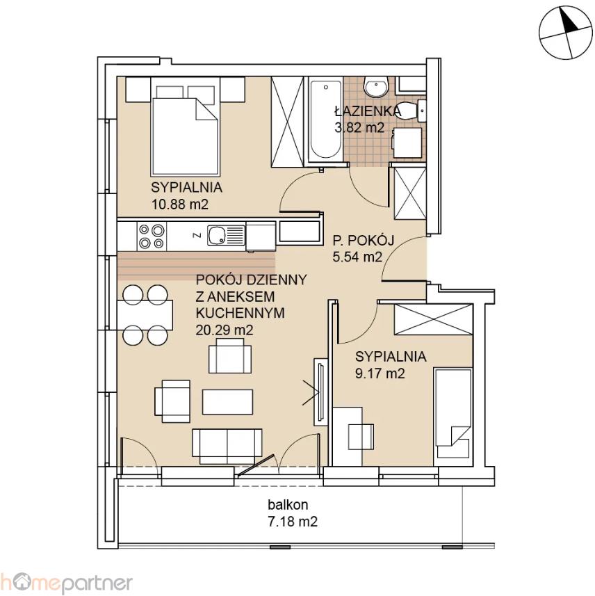 - pokój dzienny z aneksem kuchennym 20,29 m2