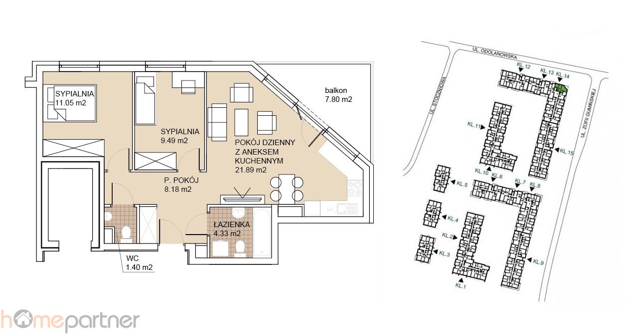 </b>- salonu z aneksem kuchennym 21,89 m2