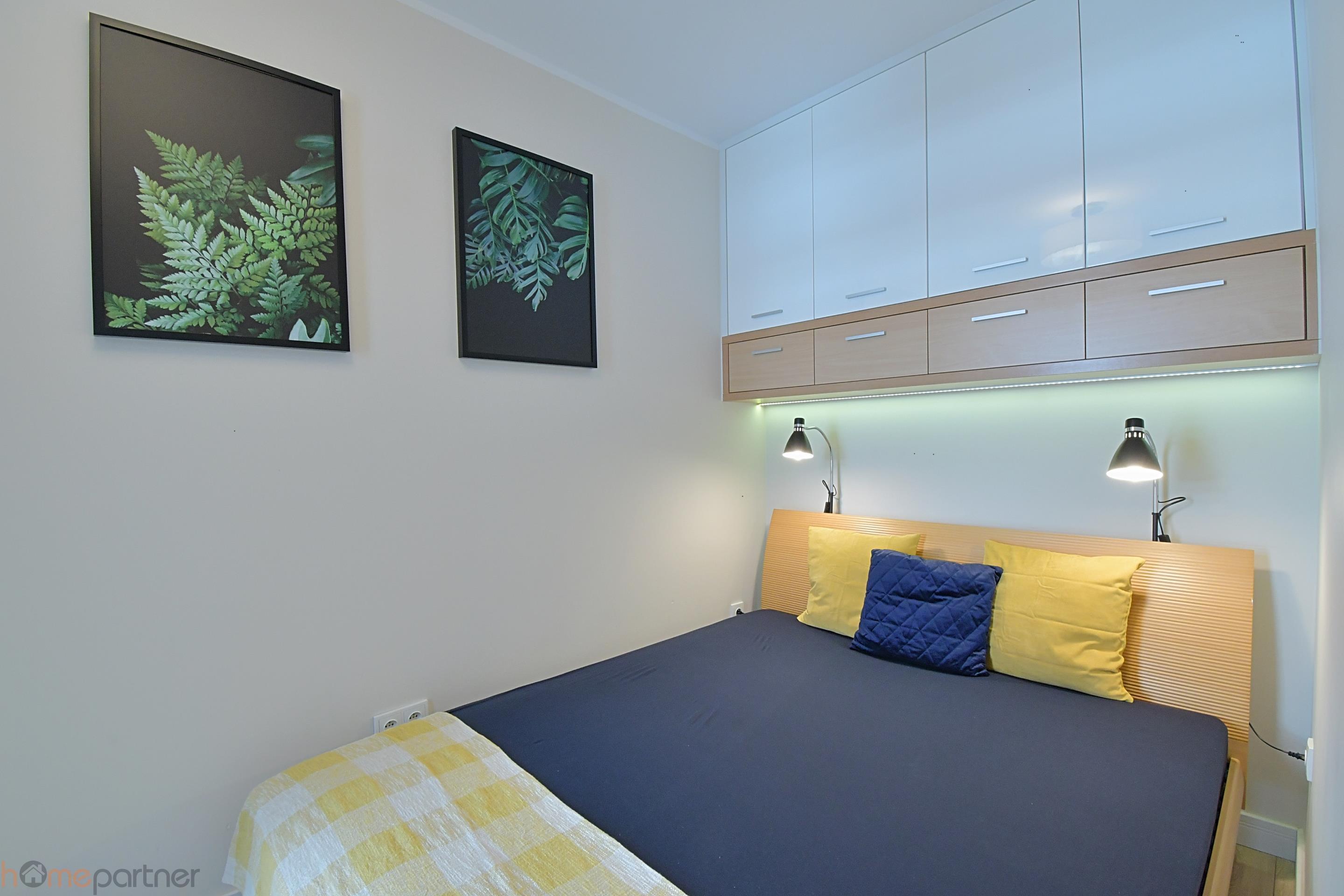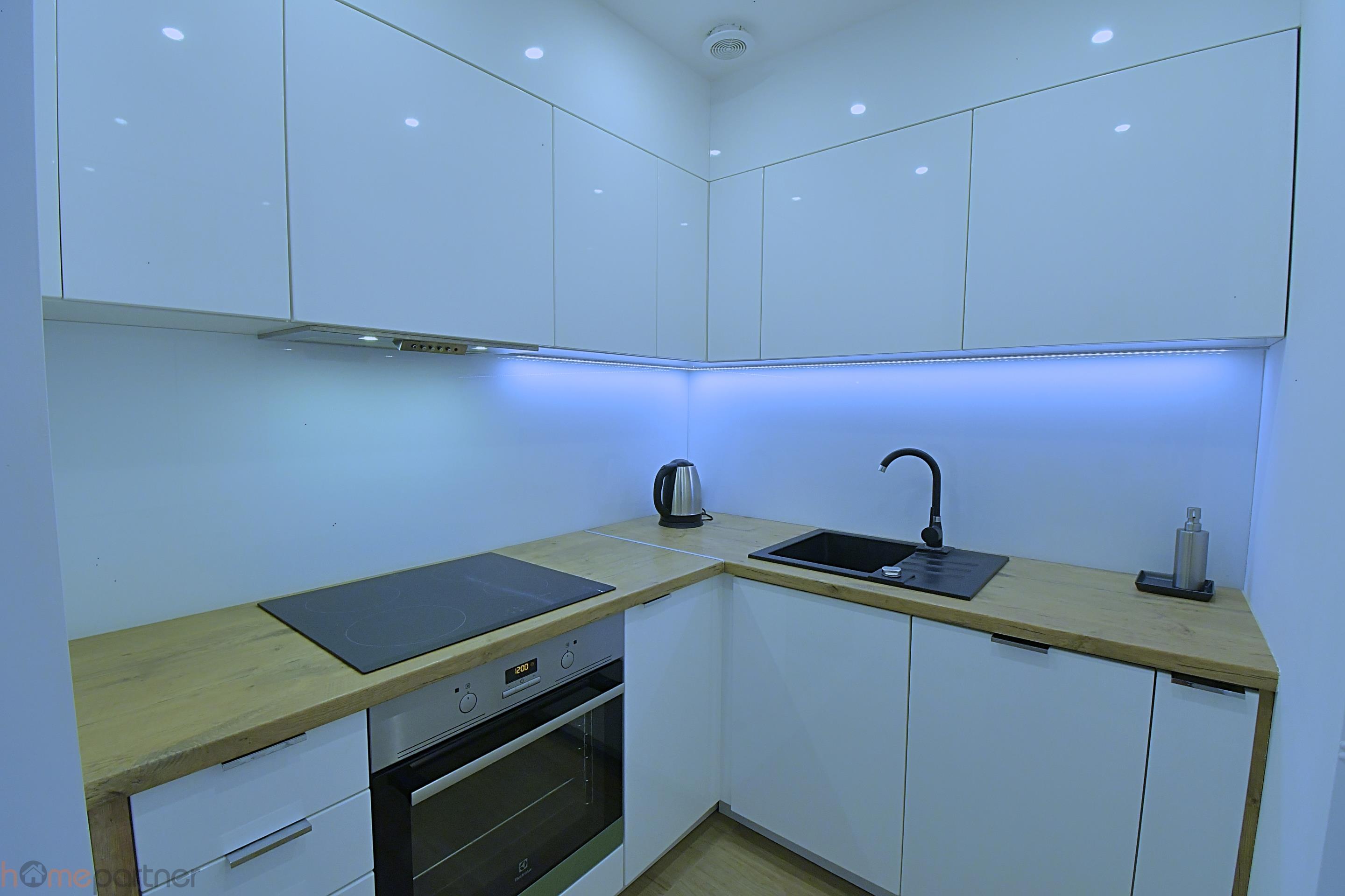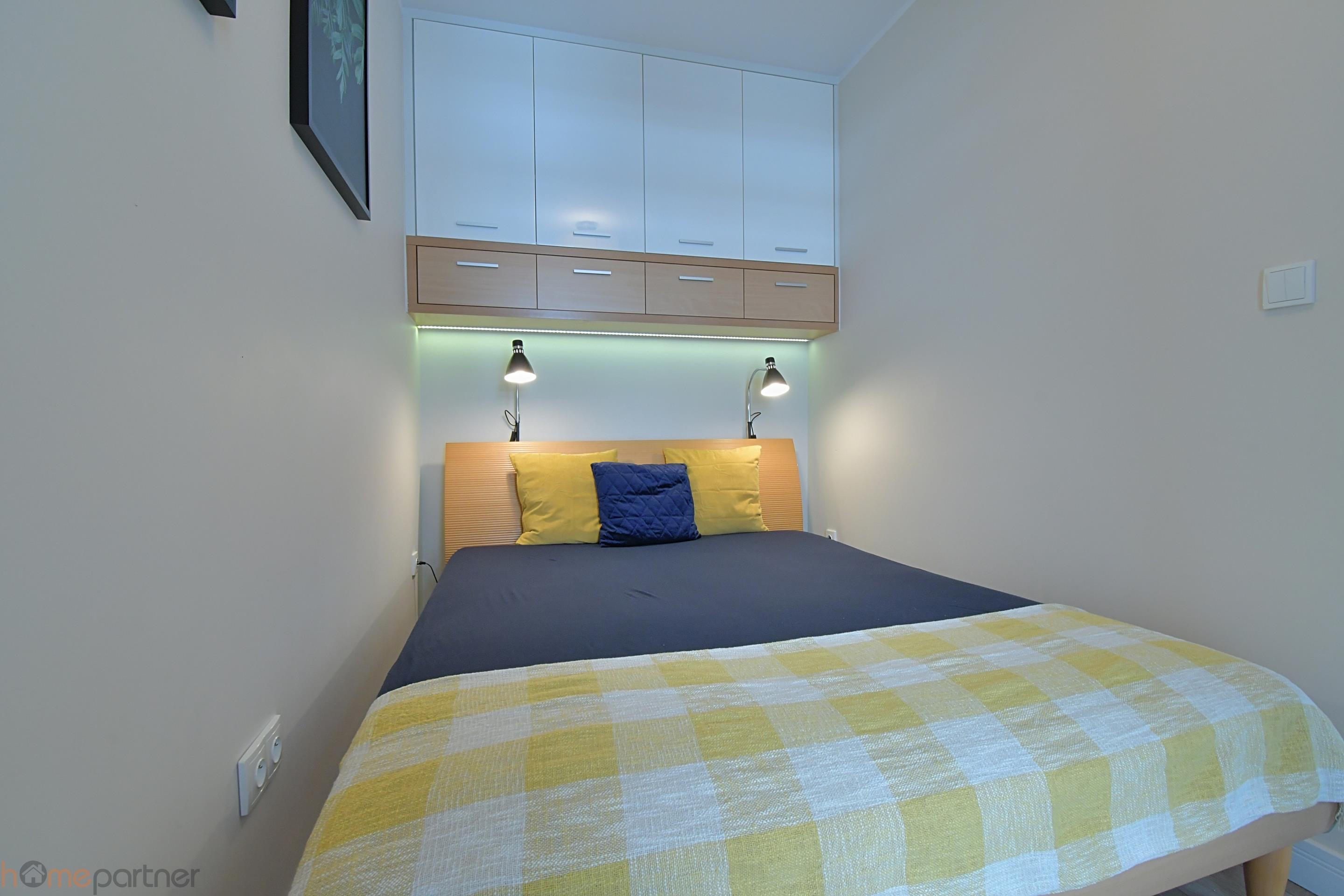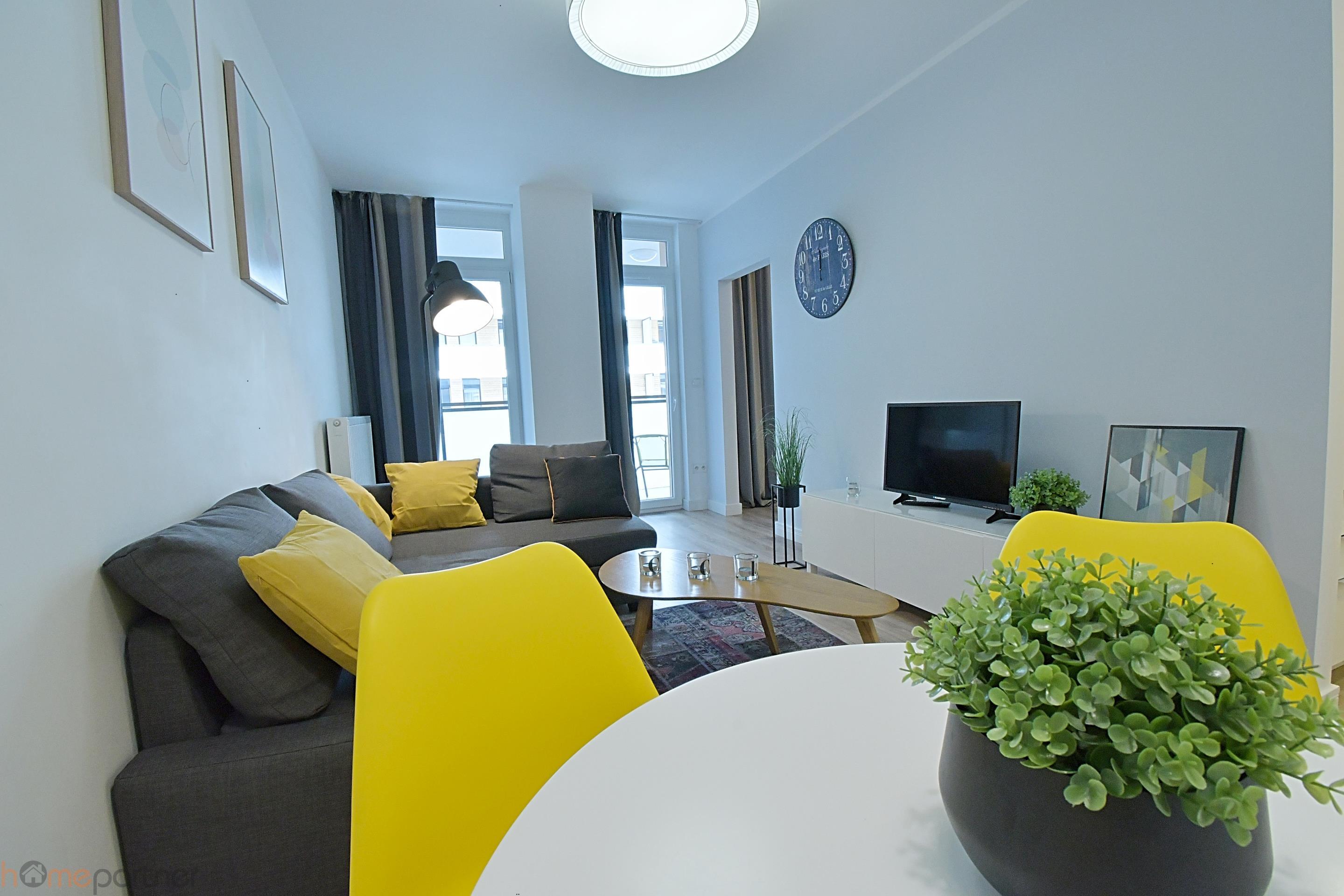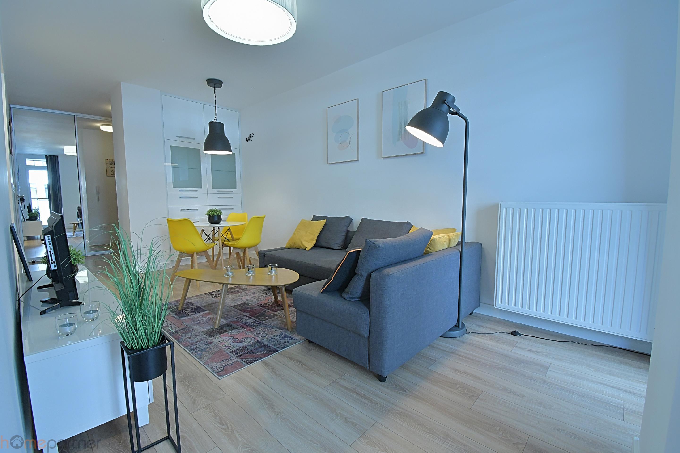 The apartment is furnished and modernly arranged in a modern style, finished with high-class materials. The kitchenette is equipped with a fridge-freezer, induction hob, oven, hood and dishwasher. Bathroom with shower equipped with a built-in wardrobe, washing machine included. There is a double bed in the bedroom. The living room is fully equipped: chest of drawers, sofa, coffee table, table.