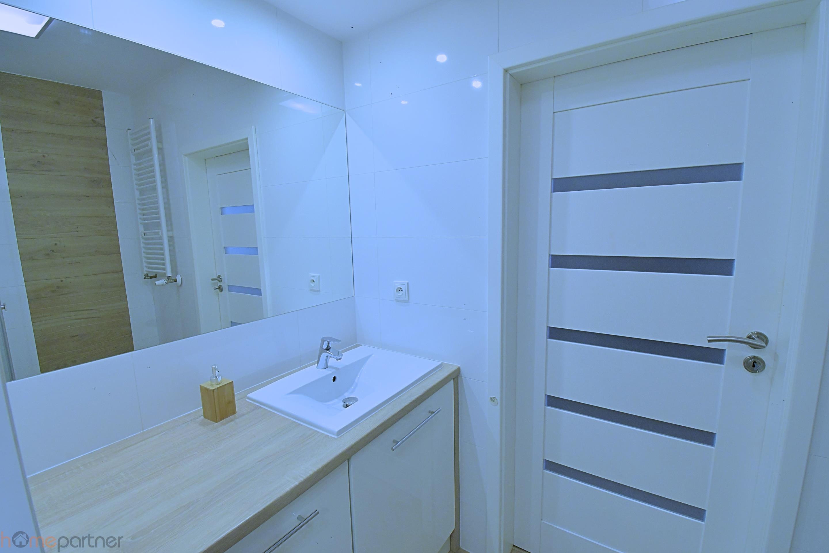 Mieszkanie jest umeblowane i nowocześnie zaaranżowane w nowoczesnym stylu, wykończone materiałami wysokiej klasy. Kuchnia w zabudowie wyposażona w lodówko-zamrażarkę, płytę indukcyjną, piekarnik, okap, zmywarkę. Łazienka z natryskiem wyposażona w zabudowaną szafę, pralka na wyposażeniu. W sypialni łóżko małżeńskie. Salon kompletnie wyposażony: komoda, sofa, ława, stół.