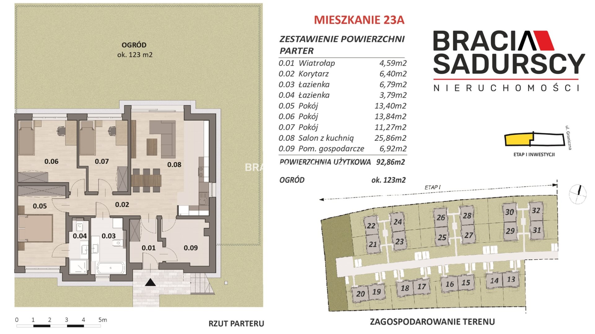 Oferowane mieszkanie znajduje się na parterze, posiada powierzchnię 93,86 m 2 i przynależny do niego ogród o powierzchni 123 m 2 ,