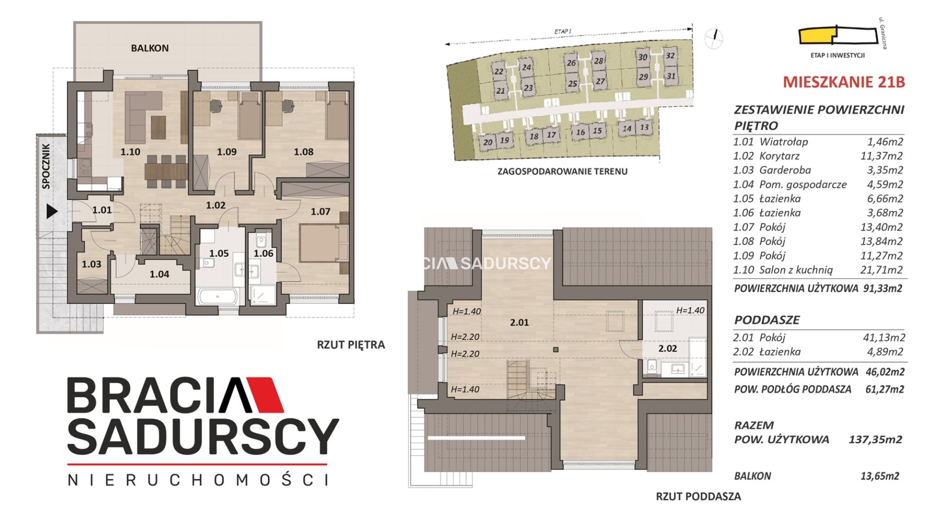 Oferowane mieszkanie mieszkanie jest dwukondygnacyjne, w jego skład wchodzi piętro i poddasze użytkowe o łącznej powierzchni 137,35m 2 oraz balkon o powierzchni ok. 14 m 2 .