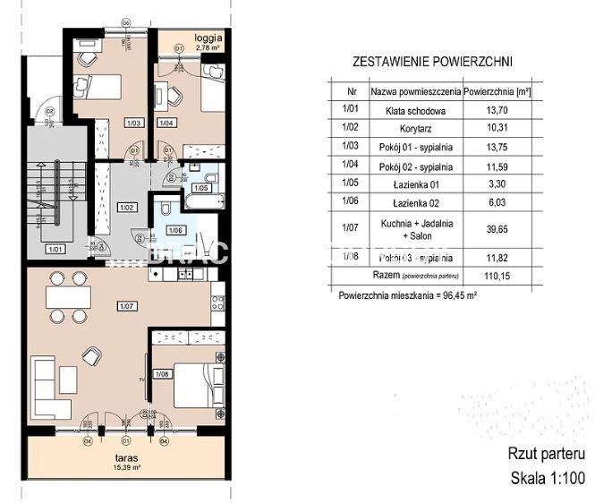Prezentujemy ofertę mieszkania zlokalizowanego w inwestycji składającej się łącznie z 15 segmentów (3 budynków) w zabudowie szeregowej. Mieszkanie na parterze w 1 piętrowym budynku o pow. użytkowej mieszkalnej 96,45 m 2 . Wejście do mieszkania poprzez klatkę schodową przynależna do 2 mieszkań. W przyziemiu budynku znajduje się garaż czterostanowiskowy i komórki lokatorskie. Do mieszkania przyporządkowany jest garaż dwustanowiskowy o pow. 39,6 m 2 , oraz komórka lokatorska o pow. 10,3 m 2 , a także do mieszkania na parterze przynależy ogródek o pow. 132 m 2 .
