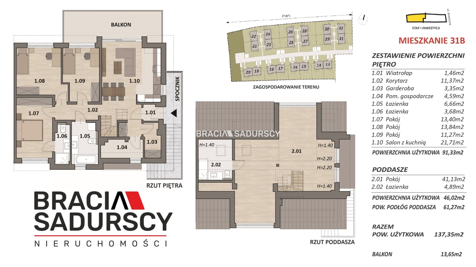 Oferowane mieszkanie mieszkanie jest dwukondygnacyjne, w jego skład wchodzi piętro i poddasze użytkowe o łącznej powierzchni 137,35m 2 oraz balkon o powierzchni ok. 14 m 2 .