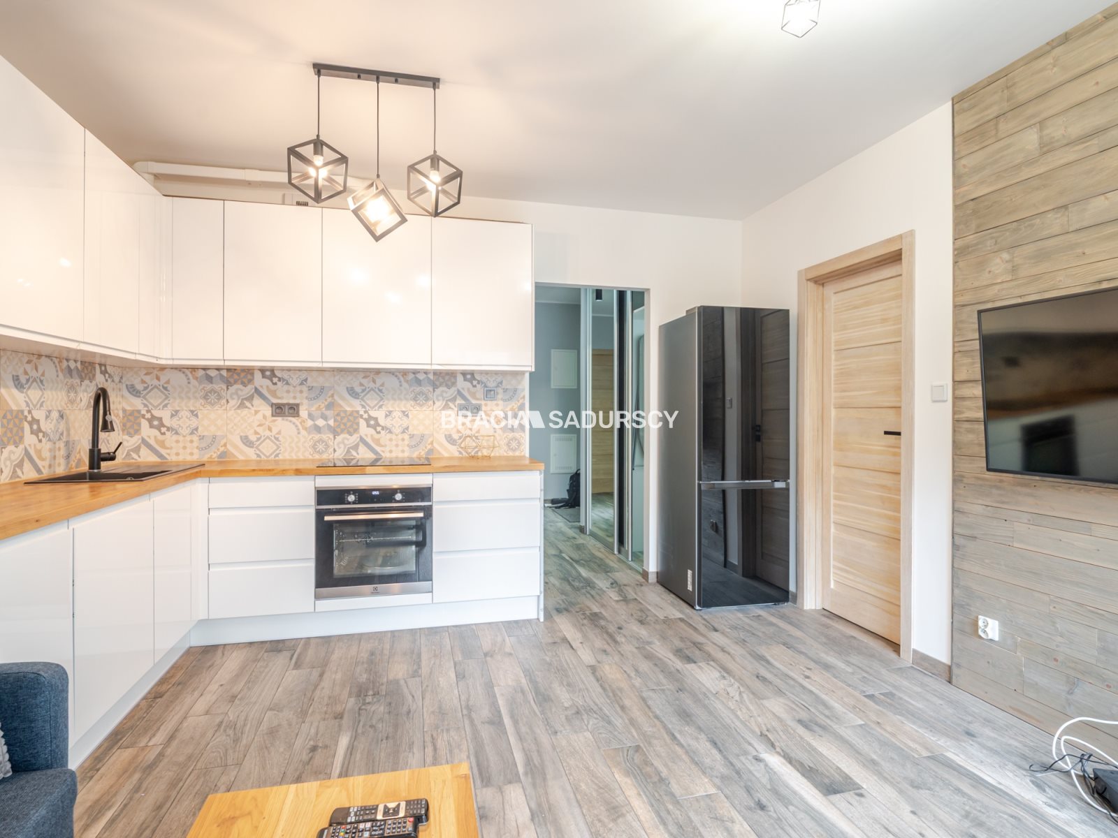 Kuchnia wyposażona w sprzęt AGD (zmywarka, piekarnik, okap, płyta, duża lodówka) oraz dębowy blat i gres imitujący drewno, wszystko wygląda jak nowe.