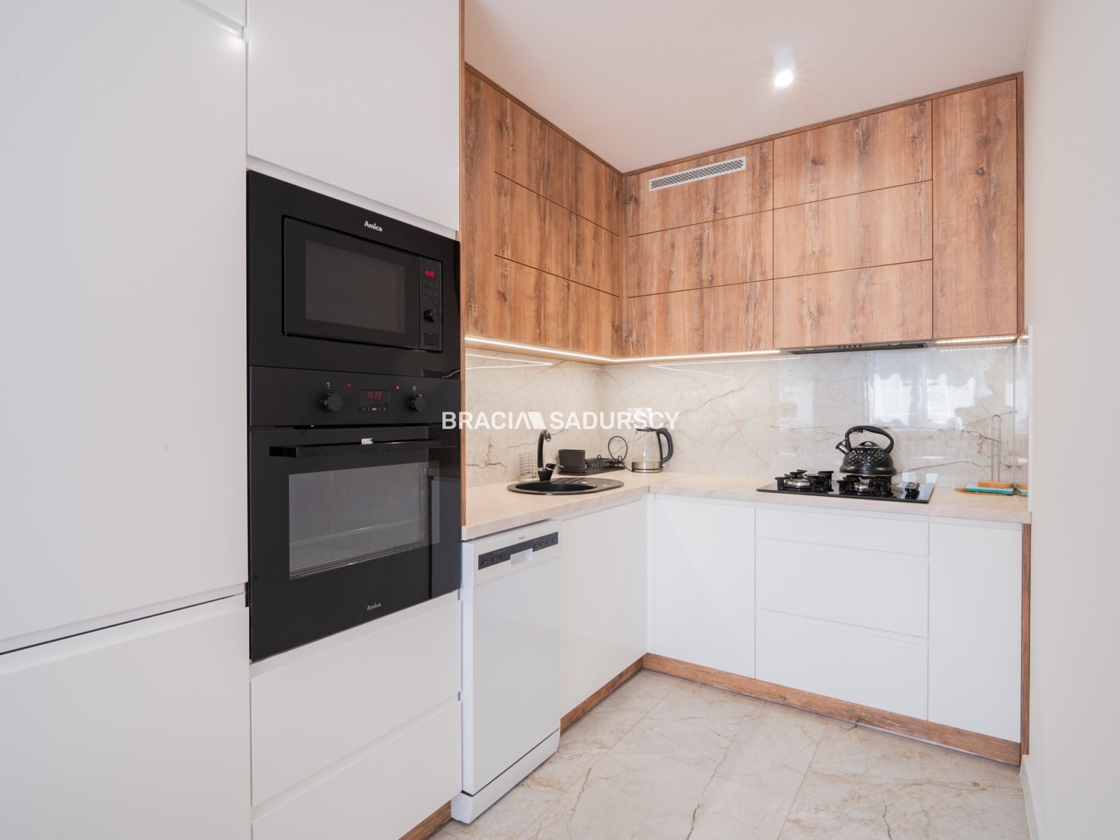Aneks kuchenny wyposażony jest w najwyższej jakości sprzęty AGD: lodówka z zamrażarką, zmywarka, piekarnik, płyta indukcyjna.