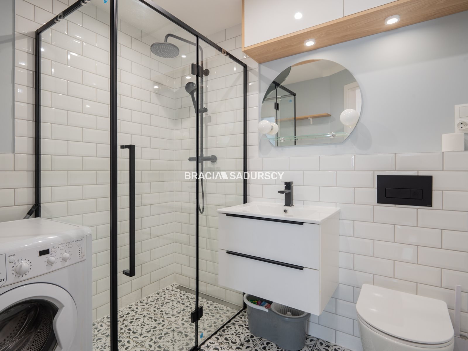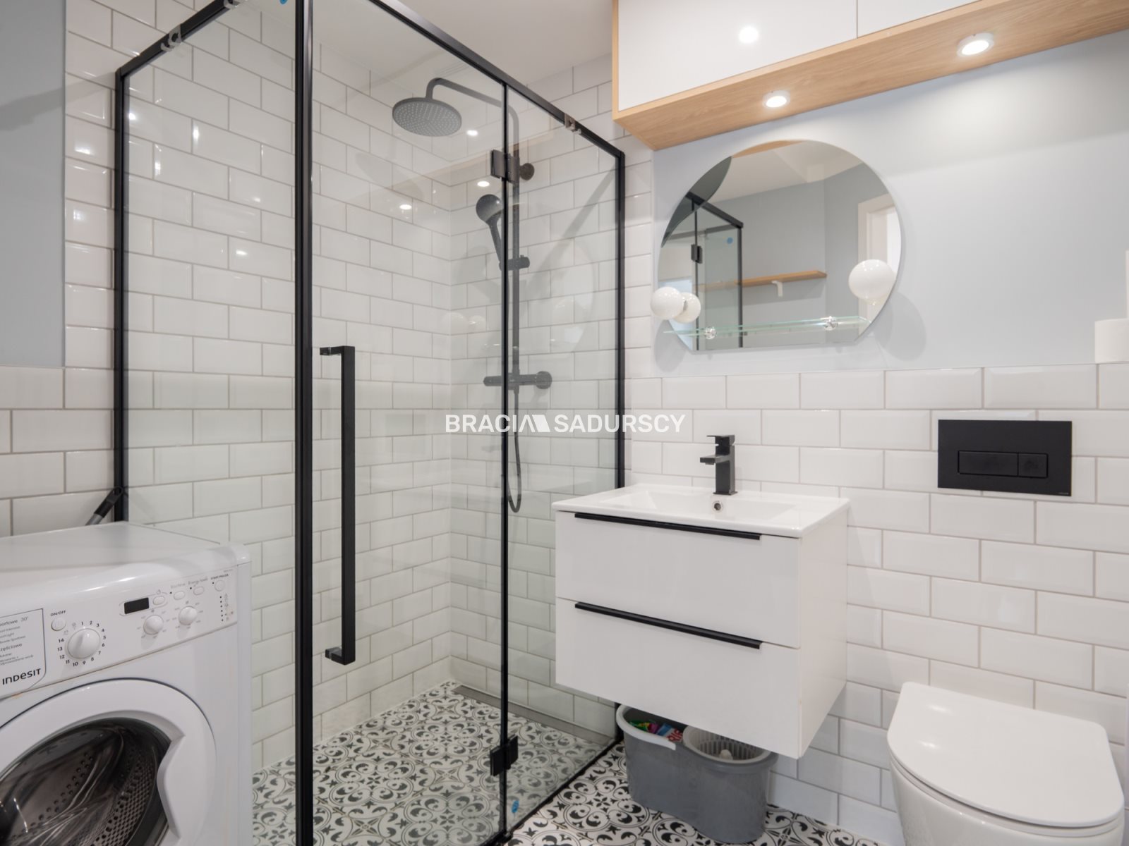 Wyposażona w toaletę, prysznic, pralkę, szafkę podblatową, regał oraz lustro.