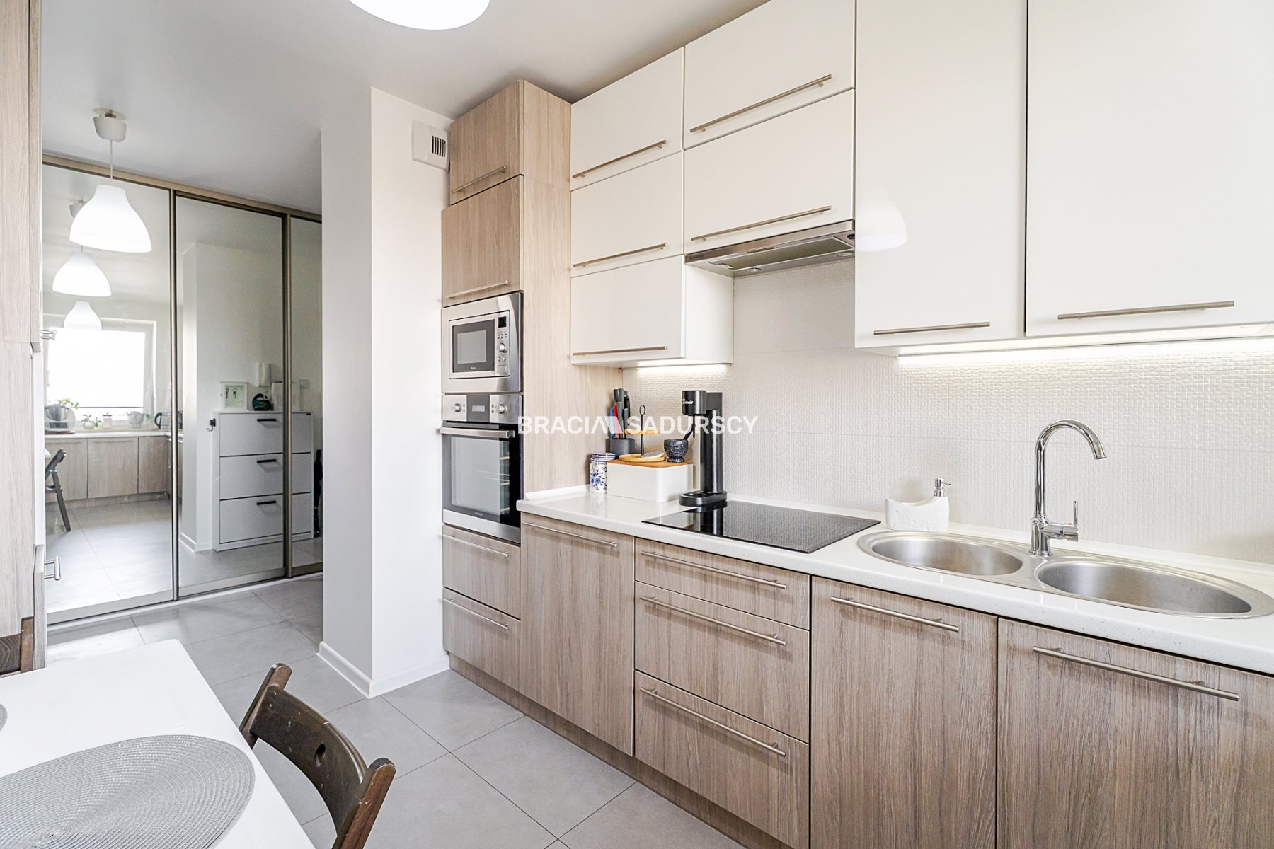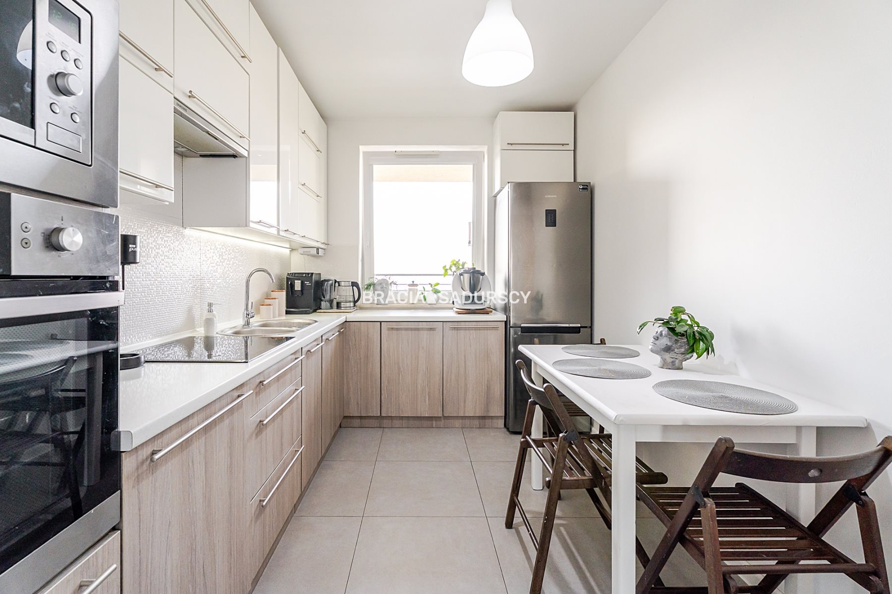 - kuchnia (ok. 8,5m2) - osobna, (aktualnie otwarta na przedpokój), jasna, z oknem - zabudowa wykonana na wymiar, liczne szafki, sporo blatu roboczego, stolik z krzesłami, sprzęty (w tym renomowanych firm): zmywarka (60cm), płyta indukcyjna, piekarnik, mikrofalówka i lodówka, okap