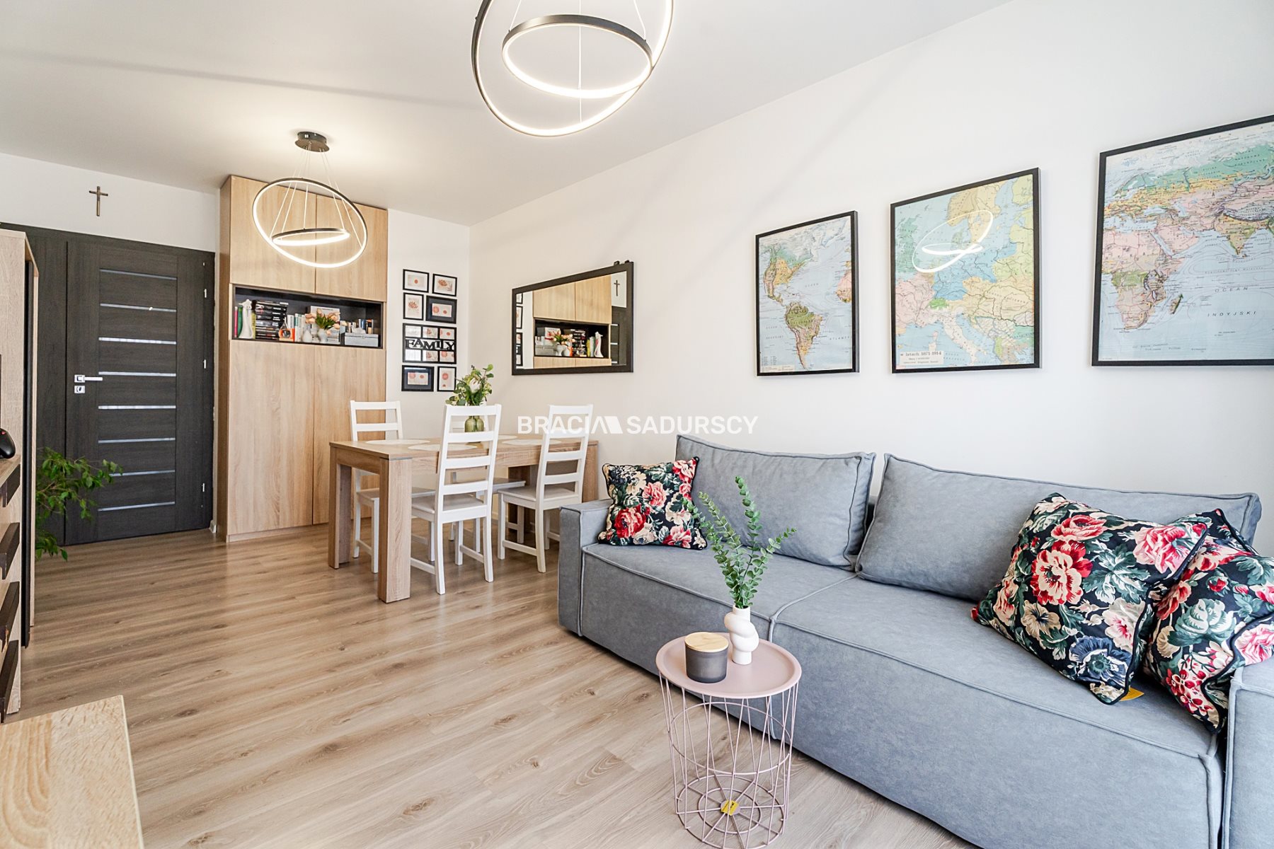 - salon (około 19m2) - funkcjonalnie i estetycznie urządzony, łączący strefę pracy z przestrzenią do relaksu. Znajduje się tu również praktyczny, duży stół, a całość uzupełniają liczne, pojemne meble zapewniające komfort przechowywania.