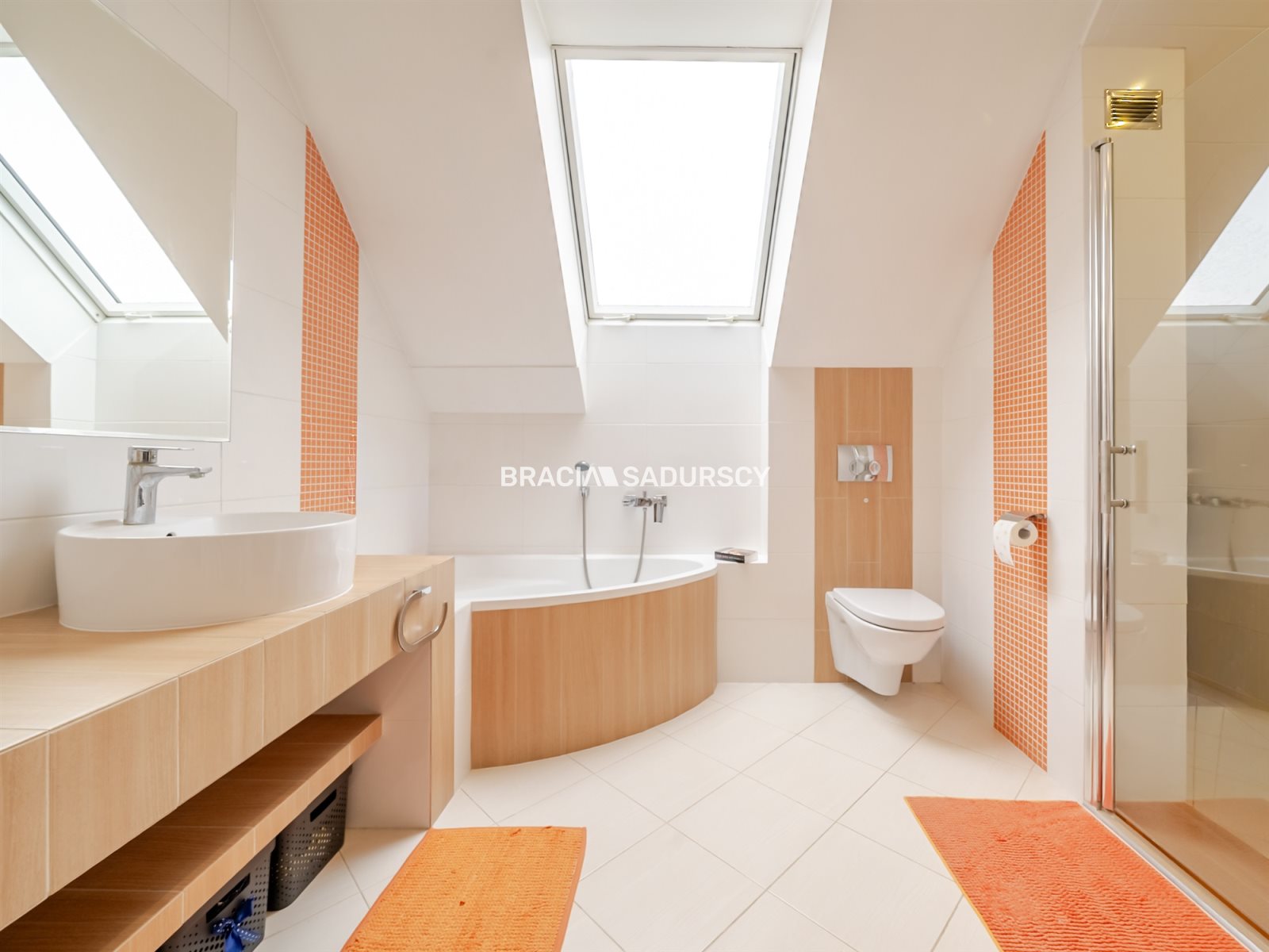 Na piętrze znajdują się trzy komfortowe pokoje , w tym główna sypialnia z przestronną garderobą , gabinet do pracy oraz pokój dziecięcy w kształcie litery L , dający szerokie możliwości aranżacyjne. Do dyspozycji mieszkańców jest również łazienka z wanną oraz dużym, wygodnym prysznicem . Dodatkową przestrzeń do przechowywania zapewnia poddasze .