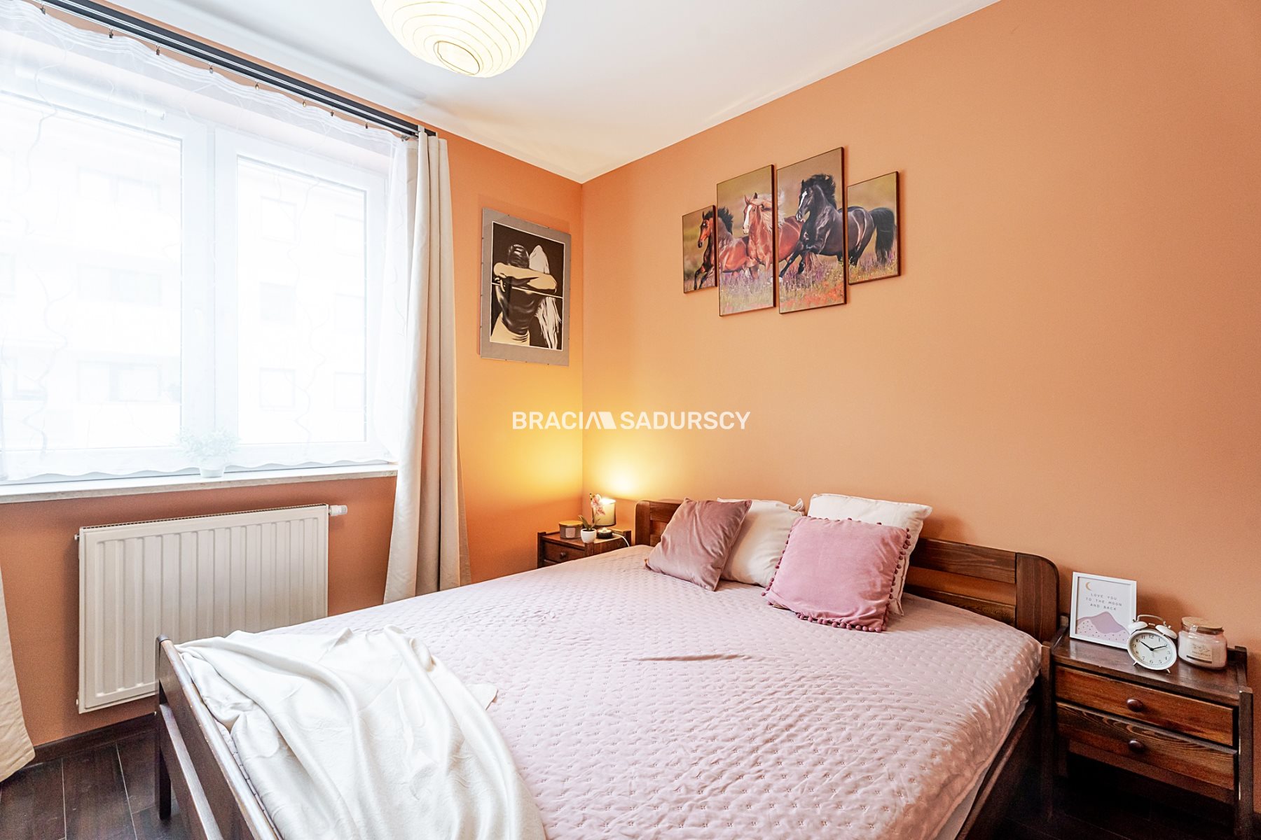 Przytulna i ustawna, z dużym łóżkiem oraz pojemną, zabudowaną garderobą z czterema drzwiami, w tym dwoma lustrzanymi, które optycznie powiększają przestrzeń.