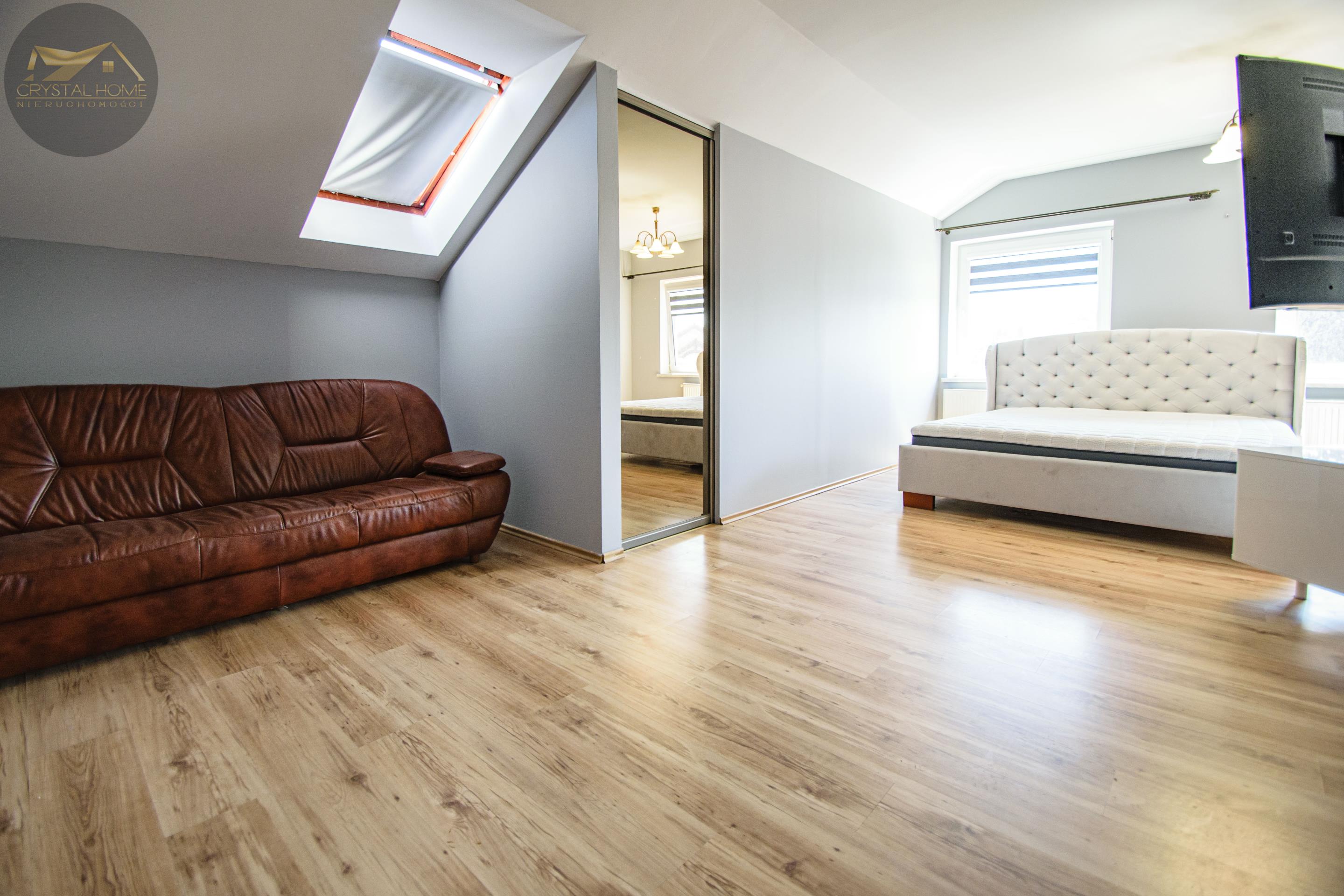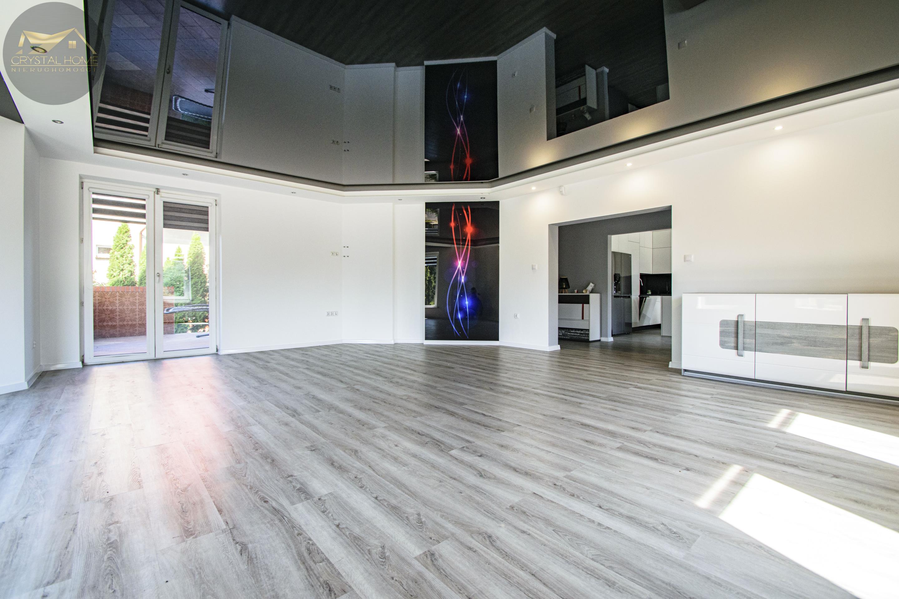 Dom wyróżnia się nowoczesnym wykończeniem na parterze, w strefie dziennej, zamontowano napinane sufity, które dodają elegancji i przestronności.