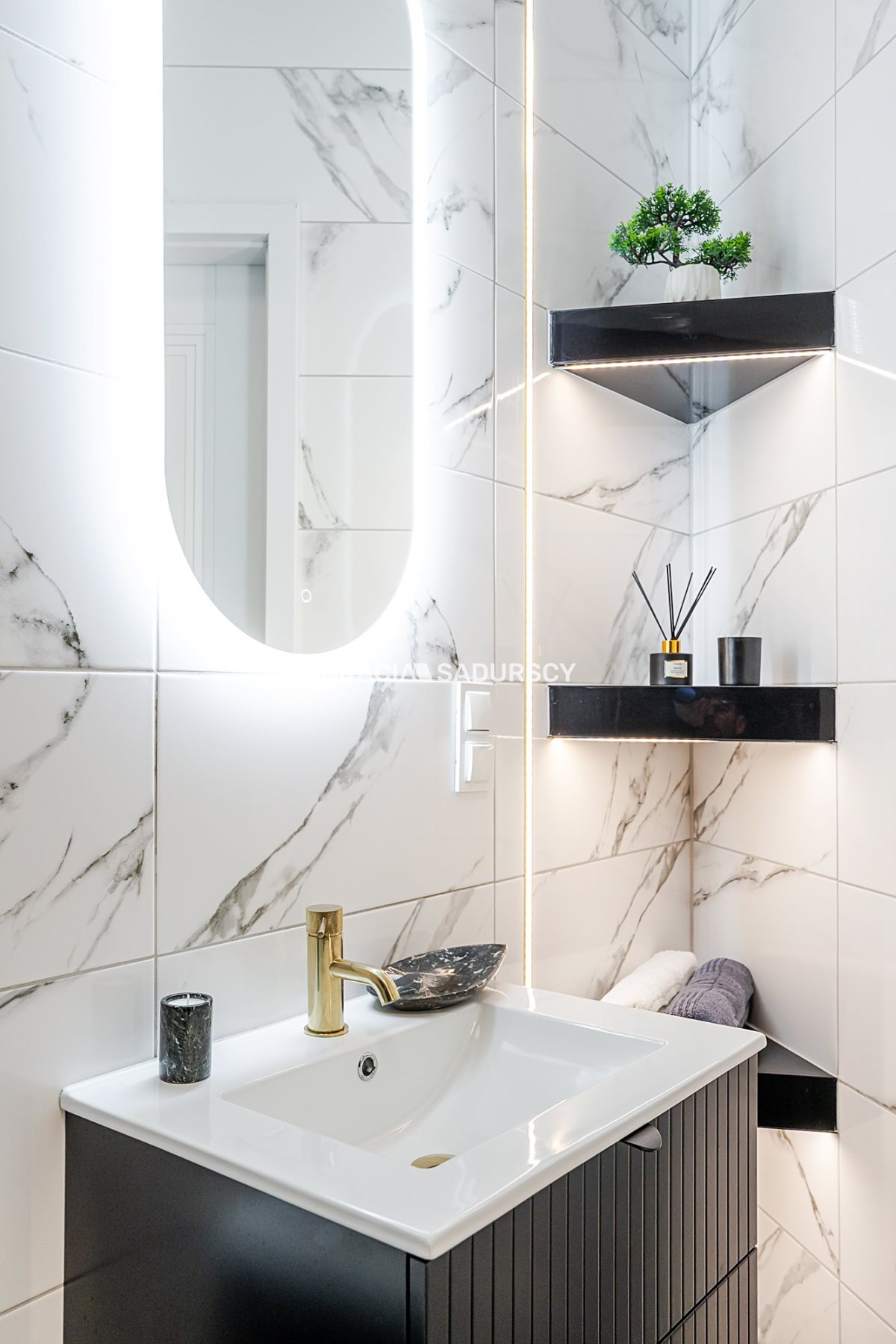 wygodna przestronna garderoba z dużą ilością półek oraz miejscem na pralkę i suszarkę,